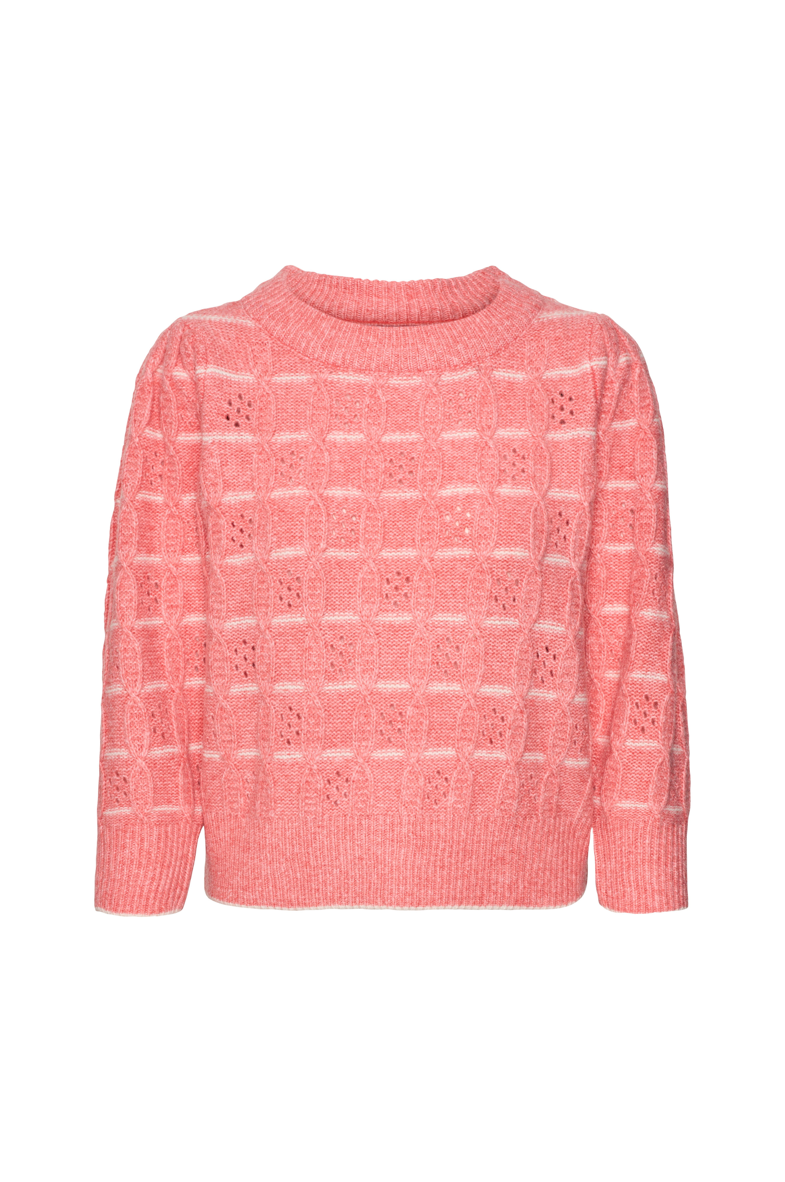 • Lige, mønsterstrikket model• Halsudskæring med bred ribkant• Lige, 3/4 langt ærme• Ribstrik ved manchetterne og ved nederste kant