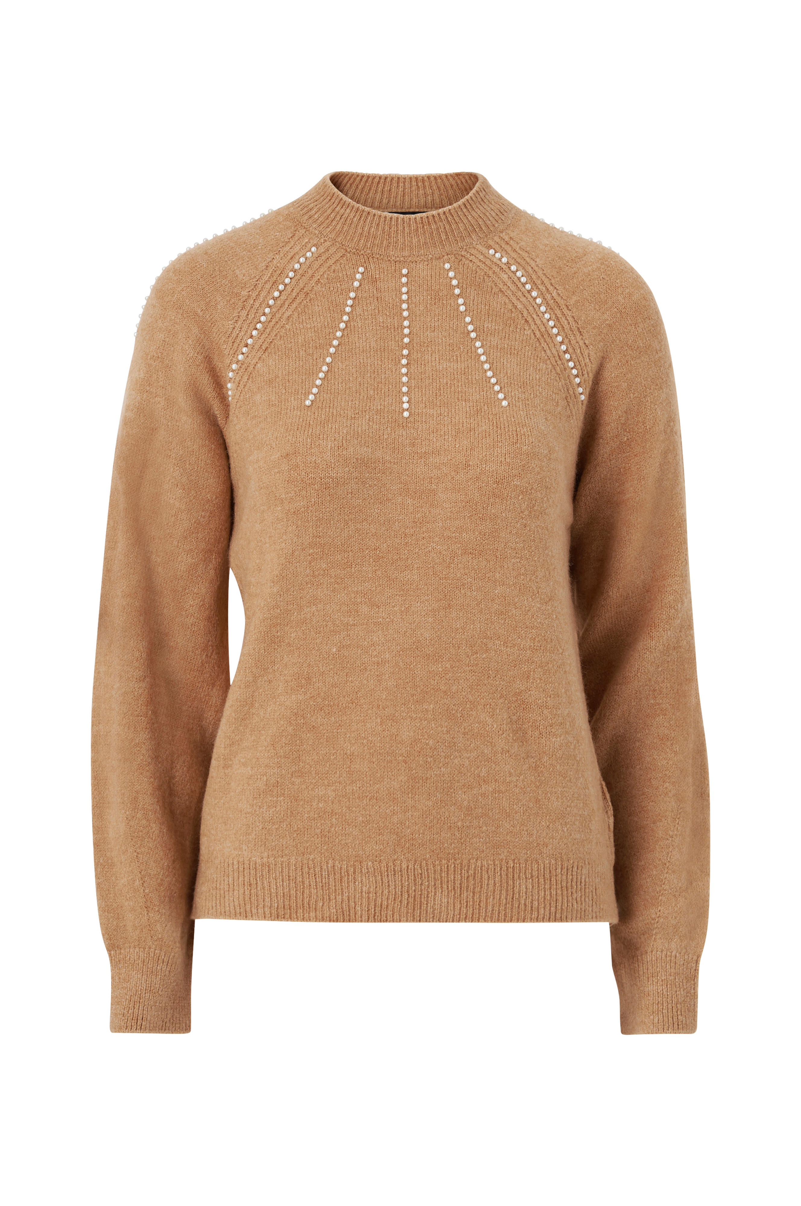 Trøje vmPeppy Pearl LS Highneck Blouse fra Vero Moda med perlepynt ved halsudskæringen foran. Noget videre raglanærme med ribstrikket ærmekant. Høj ribstrikket hals.