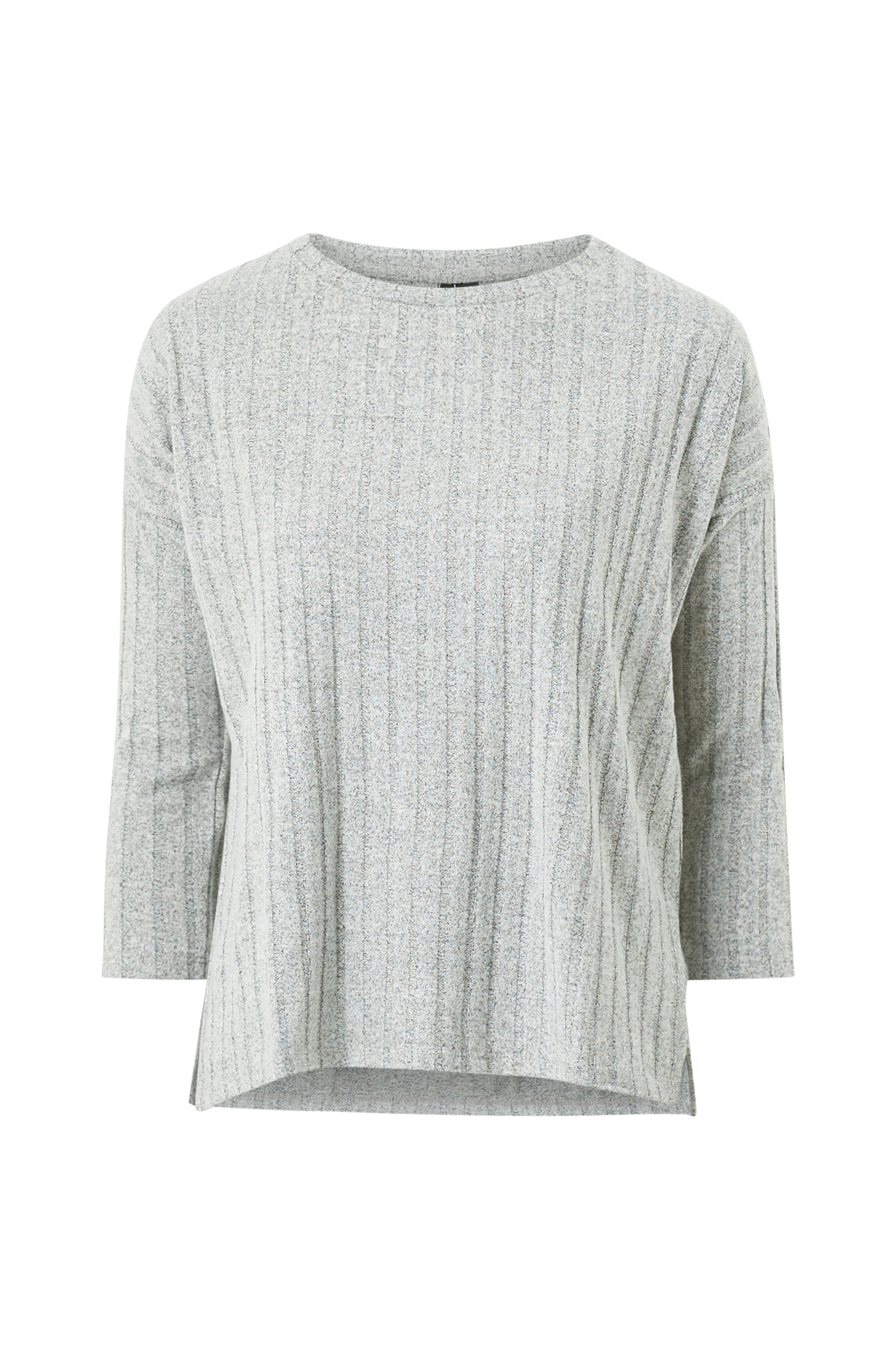 Finstrikket trøje med ribstruktur. Lige model med slidser i siderne og 3/4-lange ærmer med lav skulder.