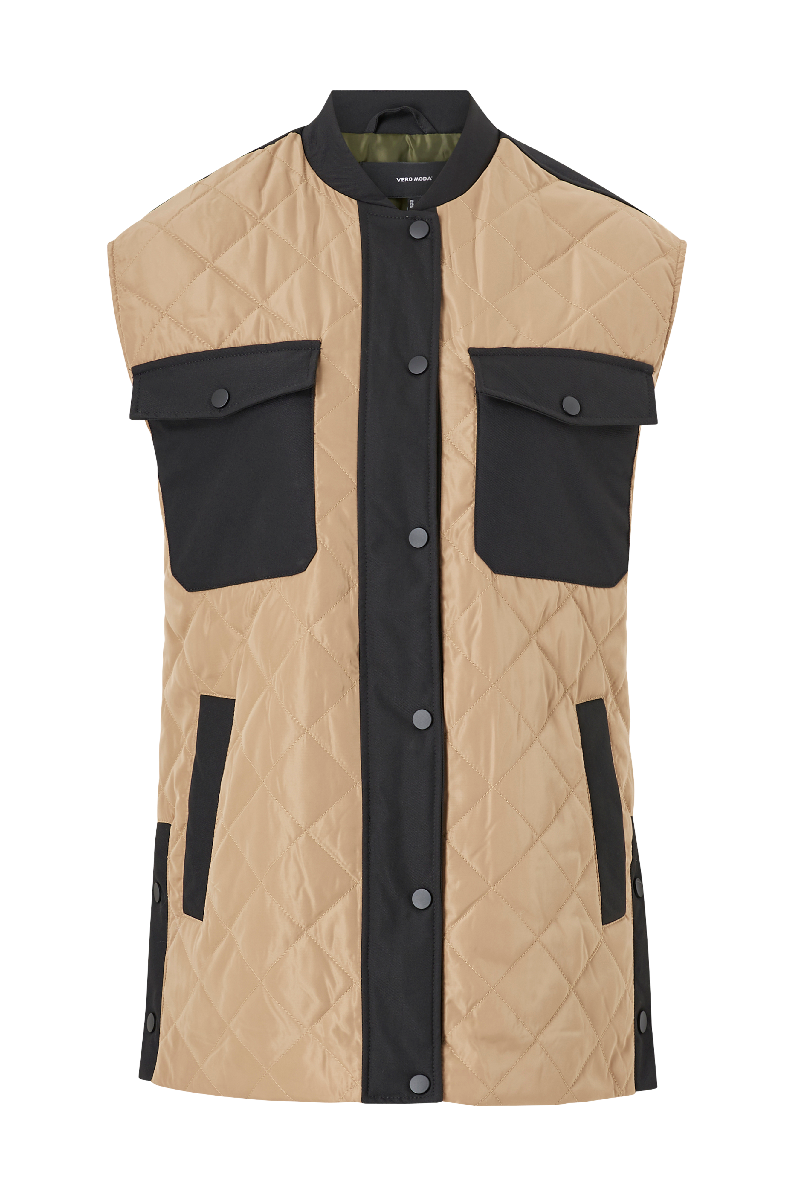 Quiltet og let vatteret vest med detaljer i vævet stof. Rund hals og trykknapper. To lommer forneden og to brystlommer med lommeklap med knap. Trykknapper i siderne forneden. Længde ca. 77 cm i str. S.