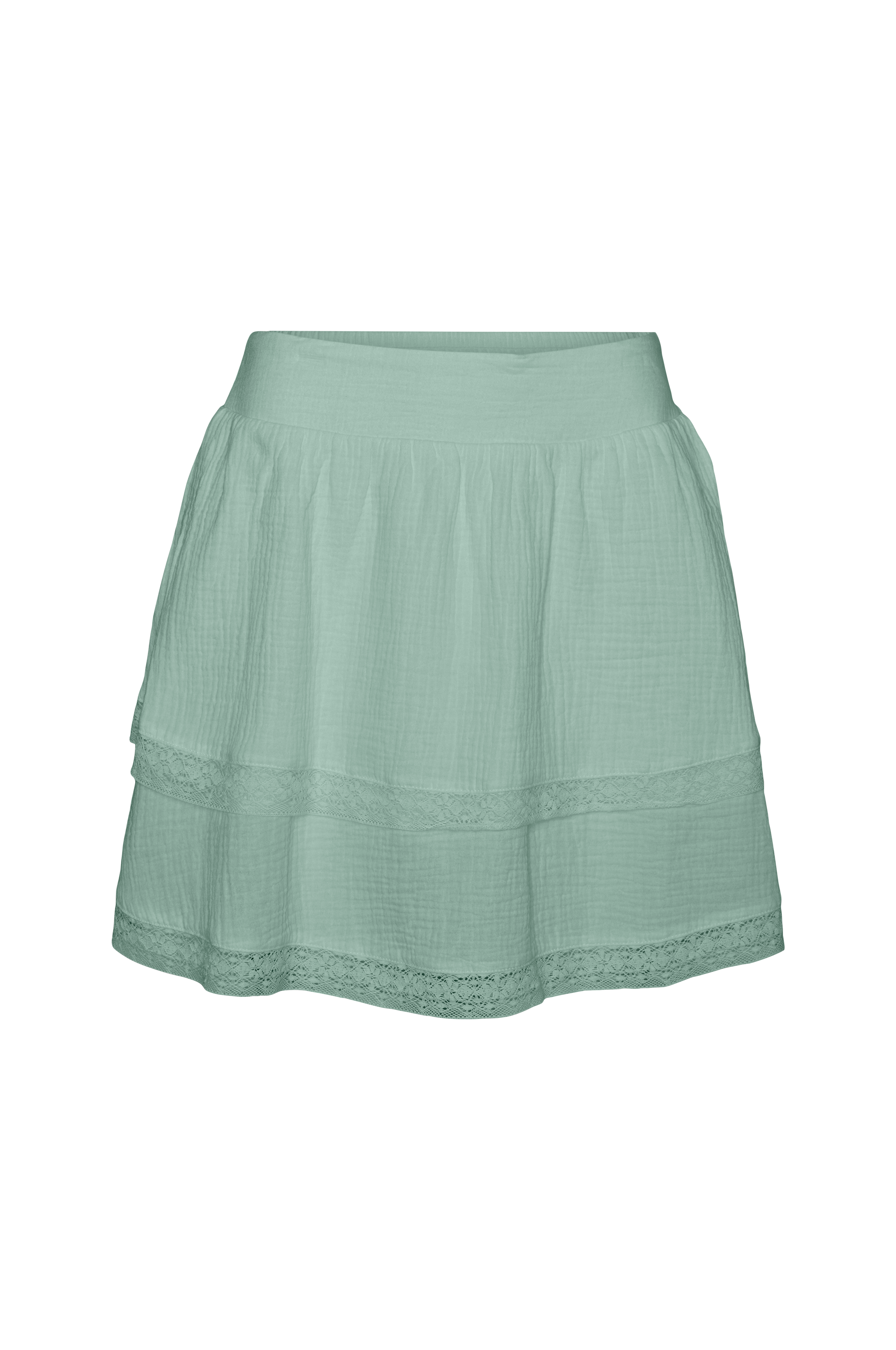 • Kort nederdel i musselin med blondedetaljer• Elastisk talje• Længde: 41 cm i størrelse S