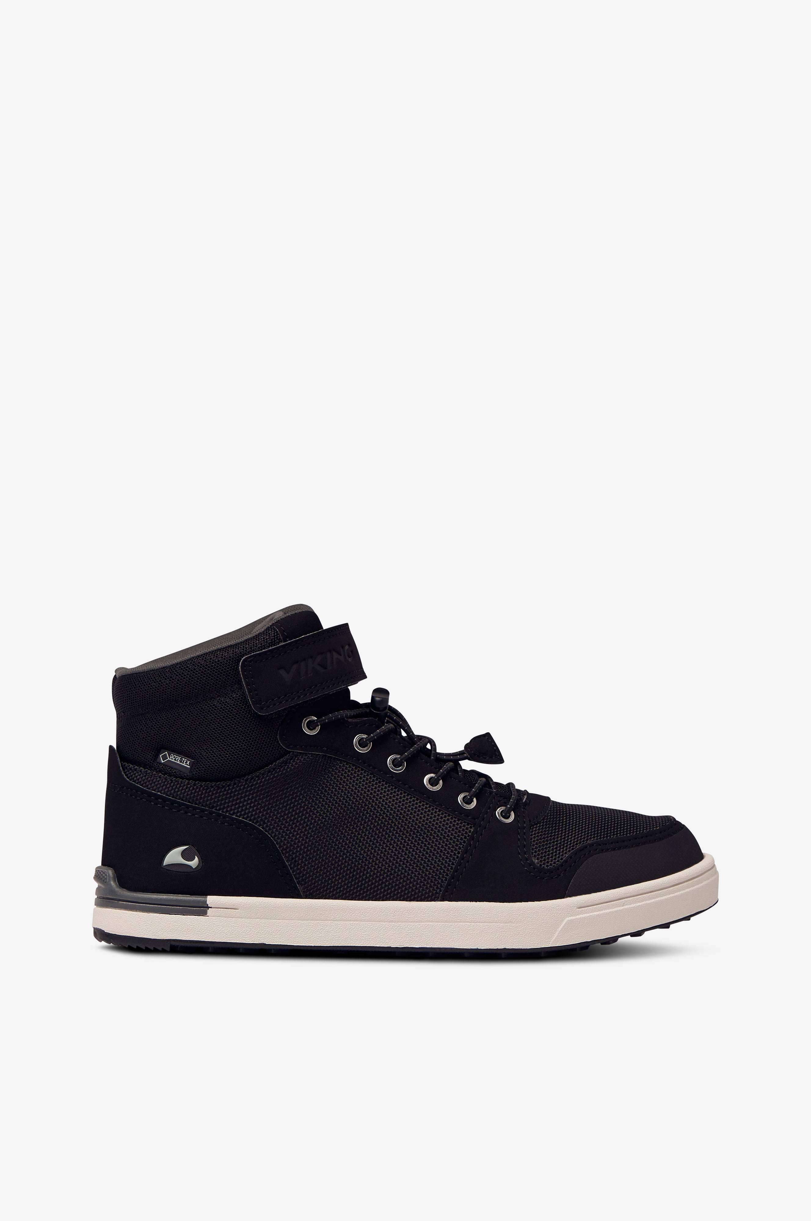 Sneakers Jakob Mid GTX Jr fra Viking i ankelhøj model med overdel i slidstærk tekstil med syntetforstærkning. GORE-TEX®-membran gør skoen helt vandtæt og samtidig åndbar. Udtagelig indersål. Skoen har elastisk quicksnøre med stop og velcrorem øverst på skaftet. Vatteret skaft og pløs.