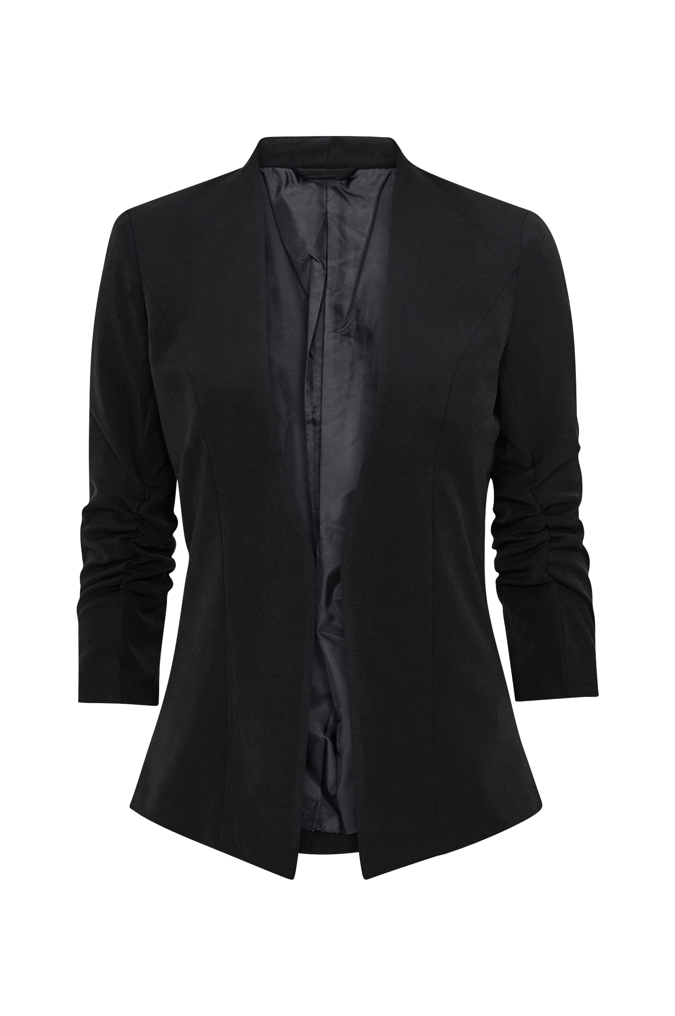 Blazer viHer 3/4 fra Vila i åben model med 3/4-langt ærme med rynkeffekt. Tynde skulderpuder. For i vævet kvalitet. Kortere bagstykke. Længde foran ca. 71 cm (længste punkte) M.