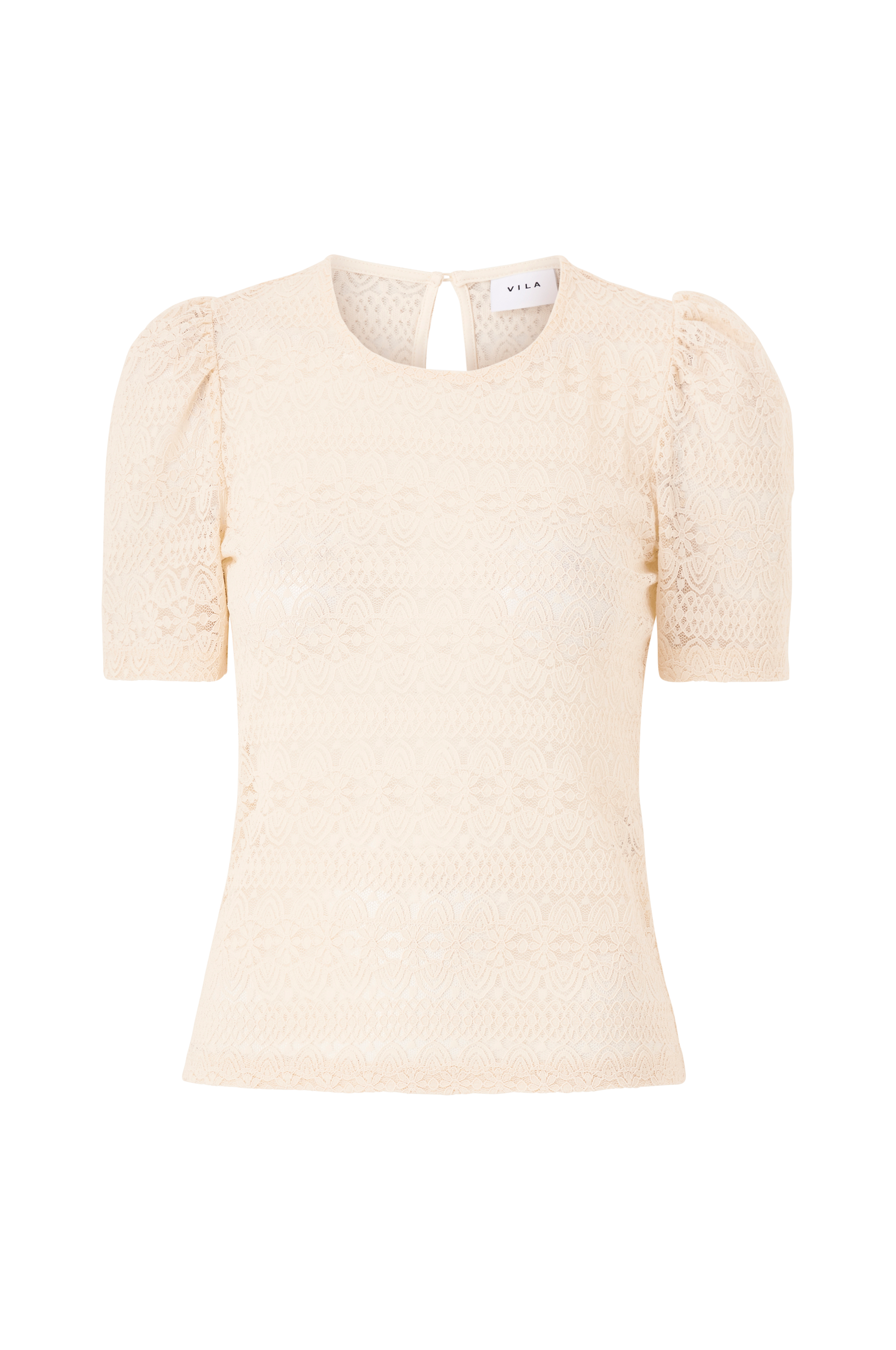 • Transparent top i elastisk blonde• Korte ballonærmer• Ventilation med knap i nakken