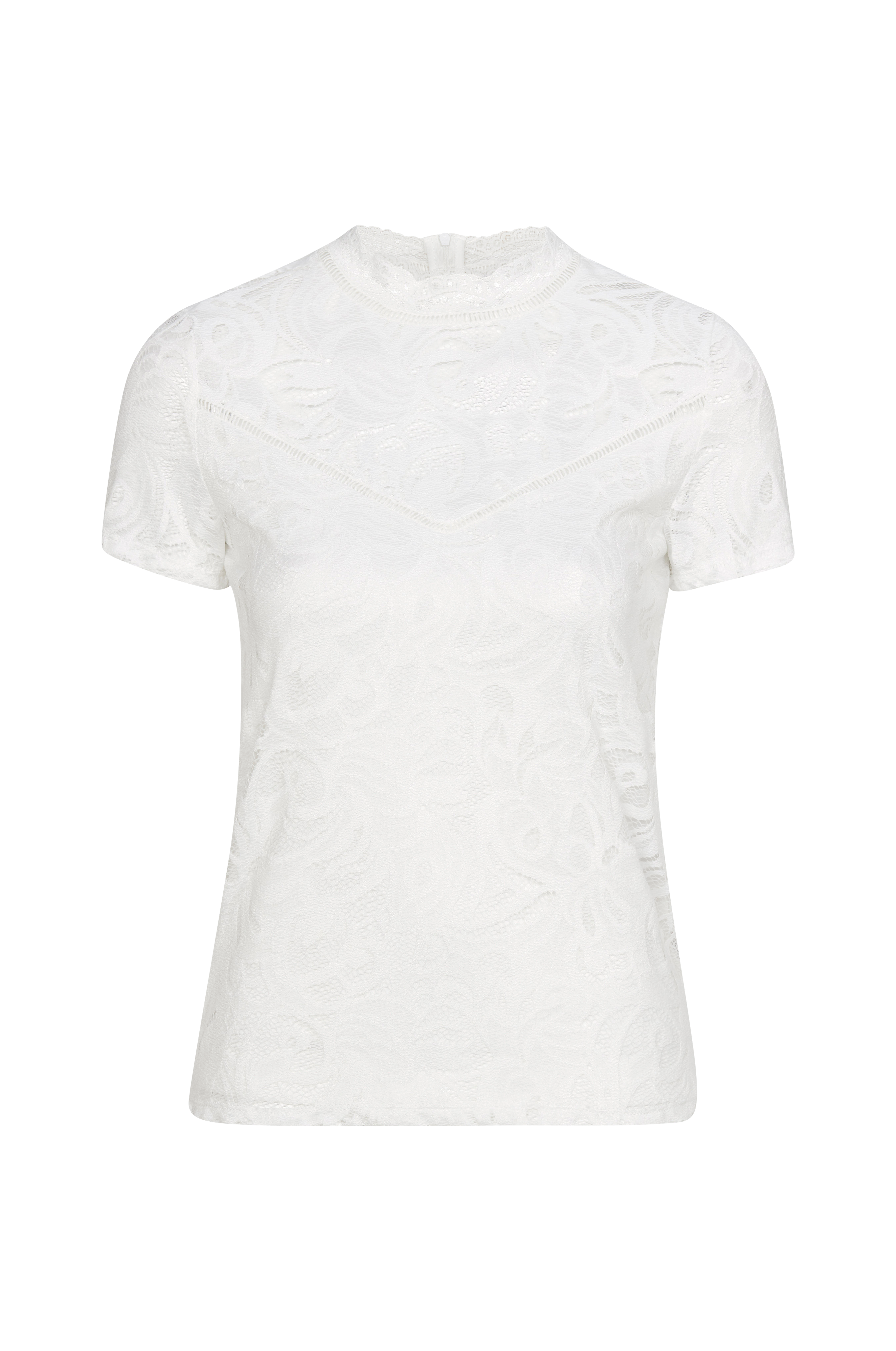Blondetop viStasia S/L Lace Top fra Vila. Let figursyet model i flot, gennembrudt blonde med jerseyfor fra brystet og ned. Kort ærme og rund hals med halvhøj kant samt skjult lynlås i nakken.