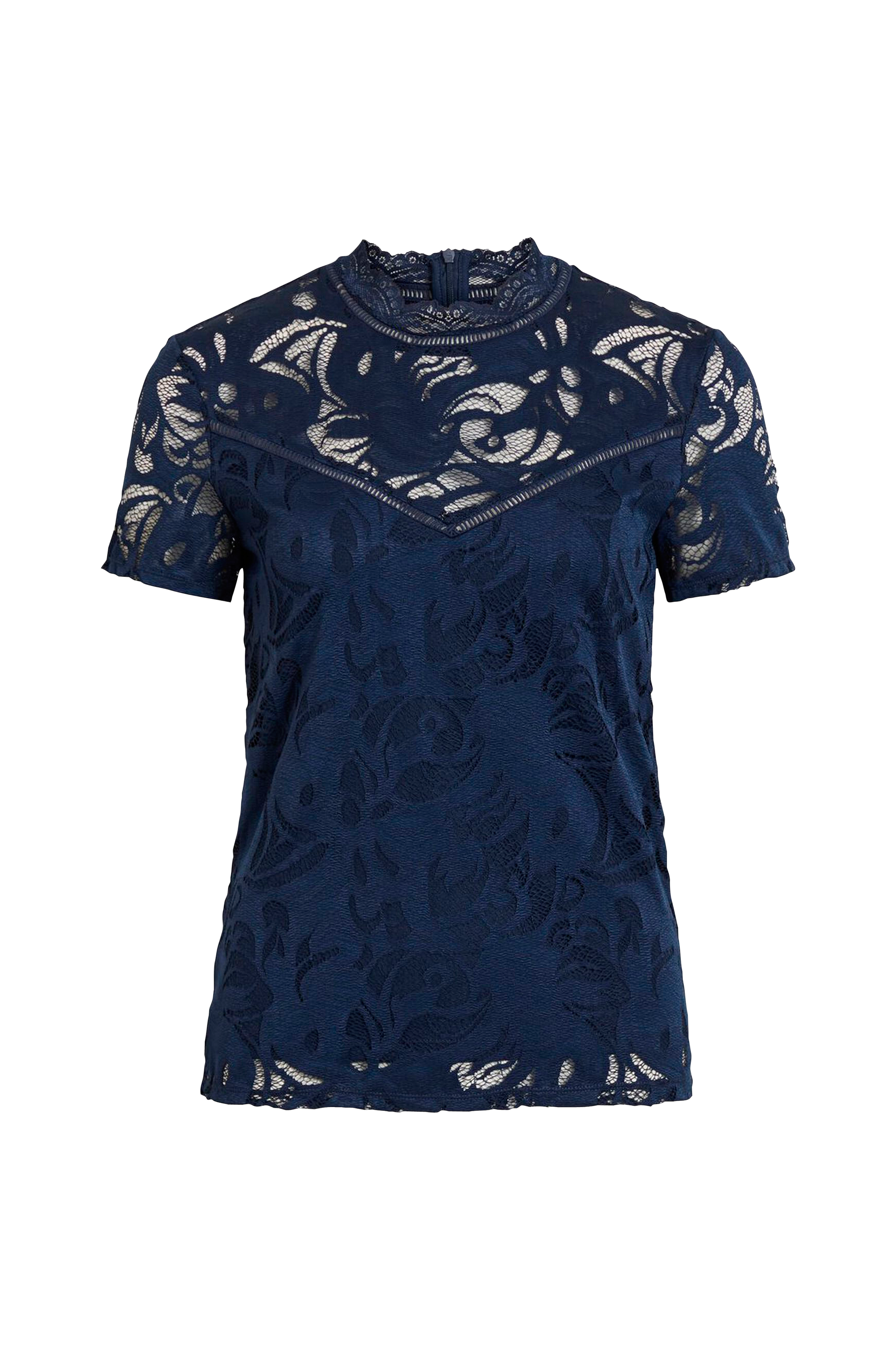 Blondetop viStasia S/L Lace Top fra Vila. Let figursyet model i flot, gennembrudt blonde med jerseyfor fra brystet og ned. Kort ærme og rund hals med halvhøj kant samt skjult lynlås i nakken.
