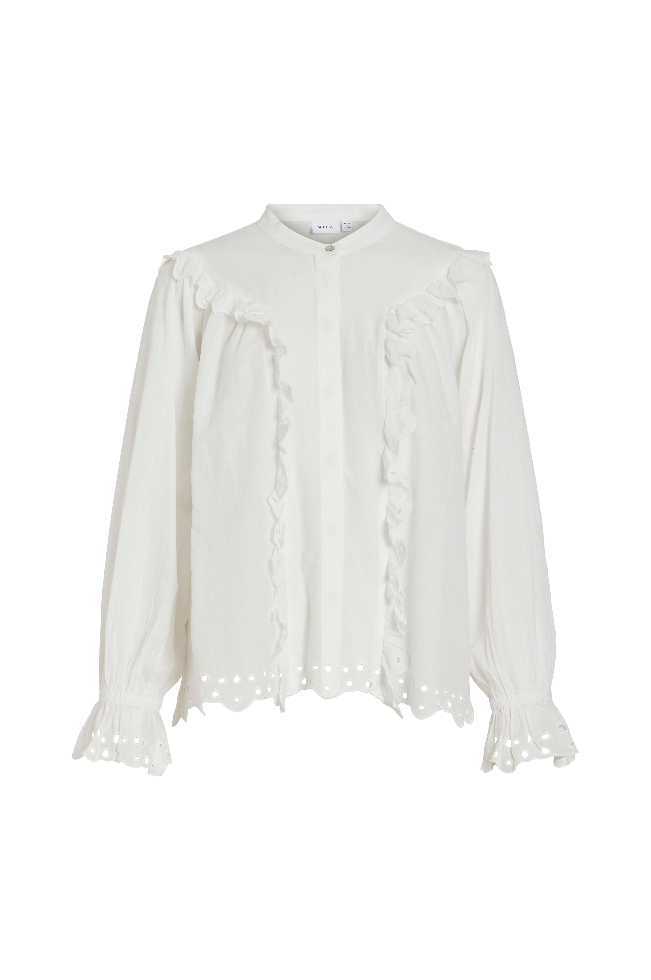 • Bred model med blondeindlæg• Rund hals• Skjulte knapper foran• Langt, bredt ærme med elastik nederst• Bølget søm med hulbroderier