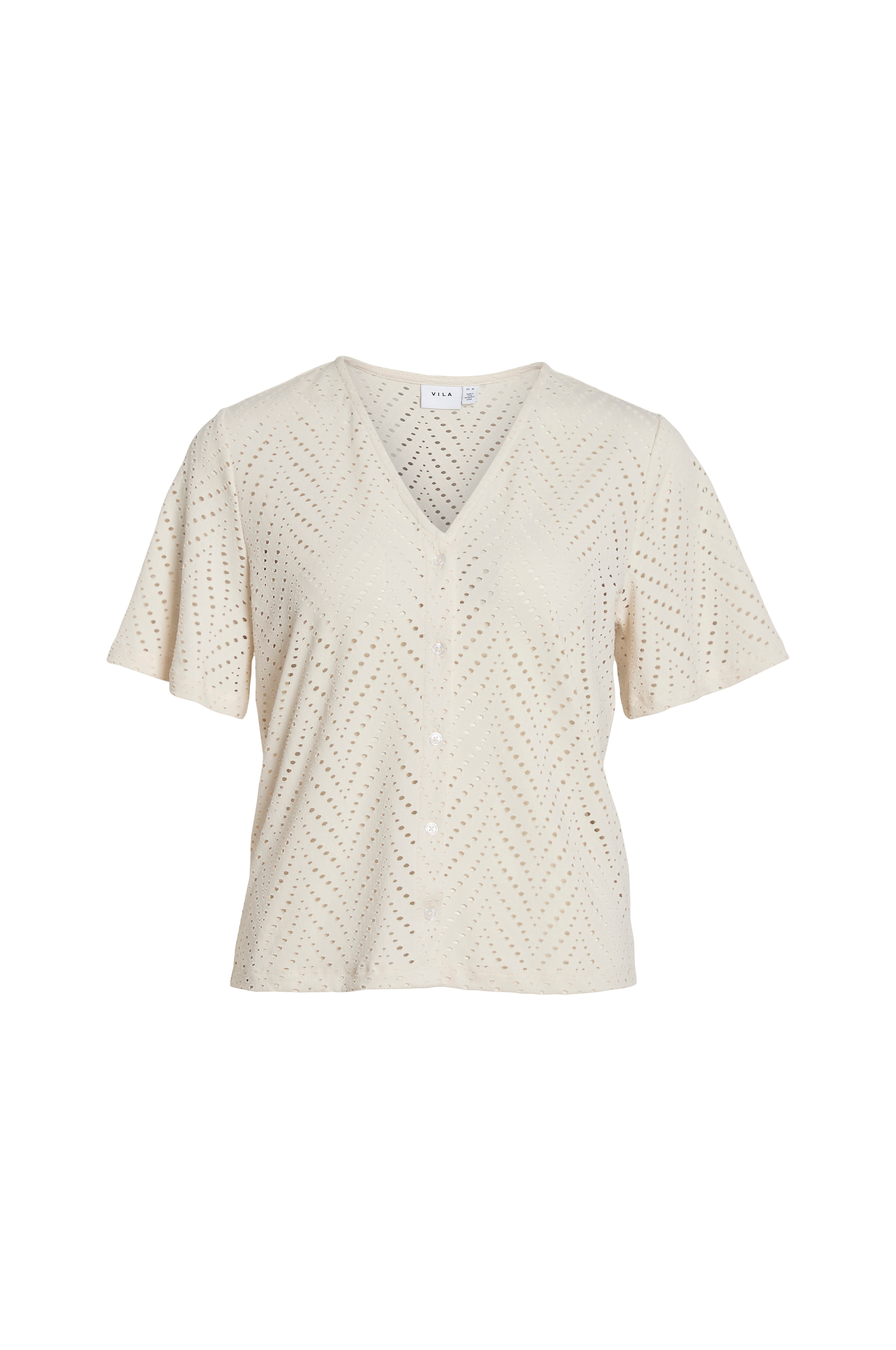 • Bluse i elastisk jersey med hulmønster• V-formet halsudskæring• Korte ærmer• Knapper foran