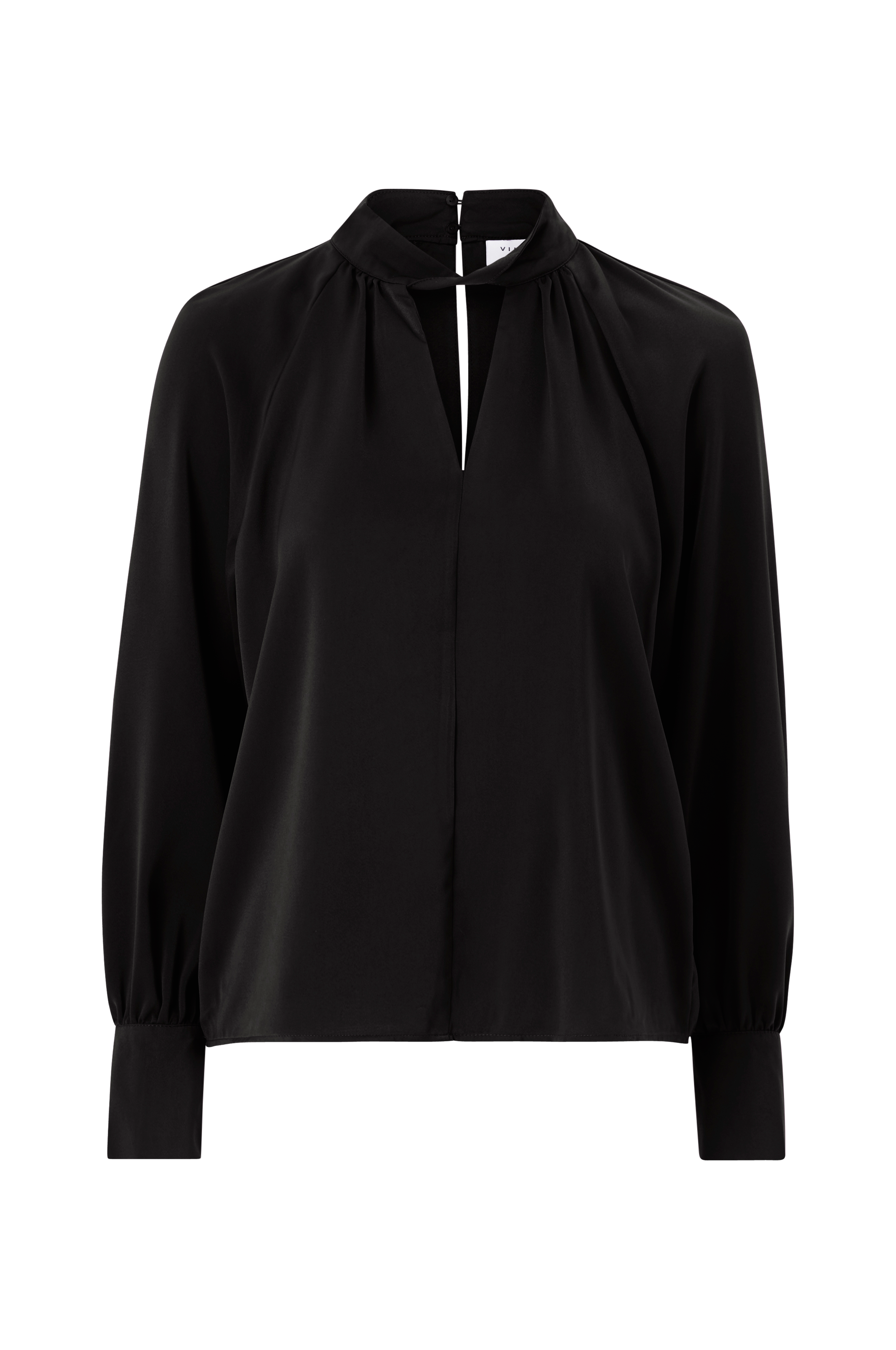 • Lige model i satin• Halvhøj halsudskæring med drapering og slids foran• Slids med knapper i nakken• Bredt raglanærme med bred manchet