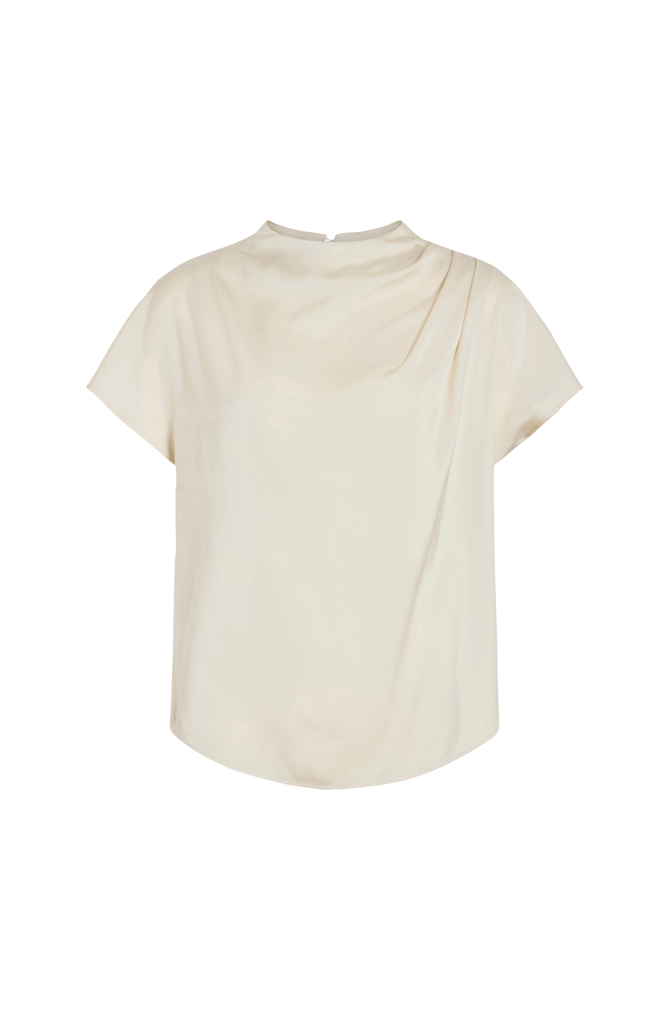 • Kortærmet bluse i satin• Høj krave• Bølgeformede detaljer• Slids med knap i nakken