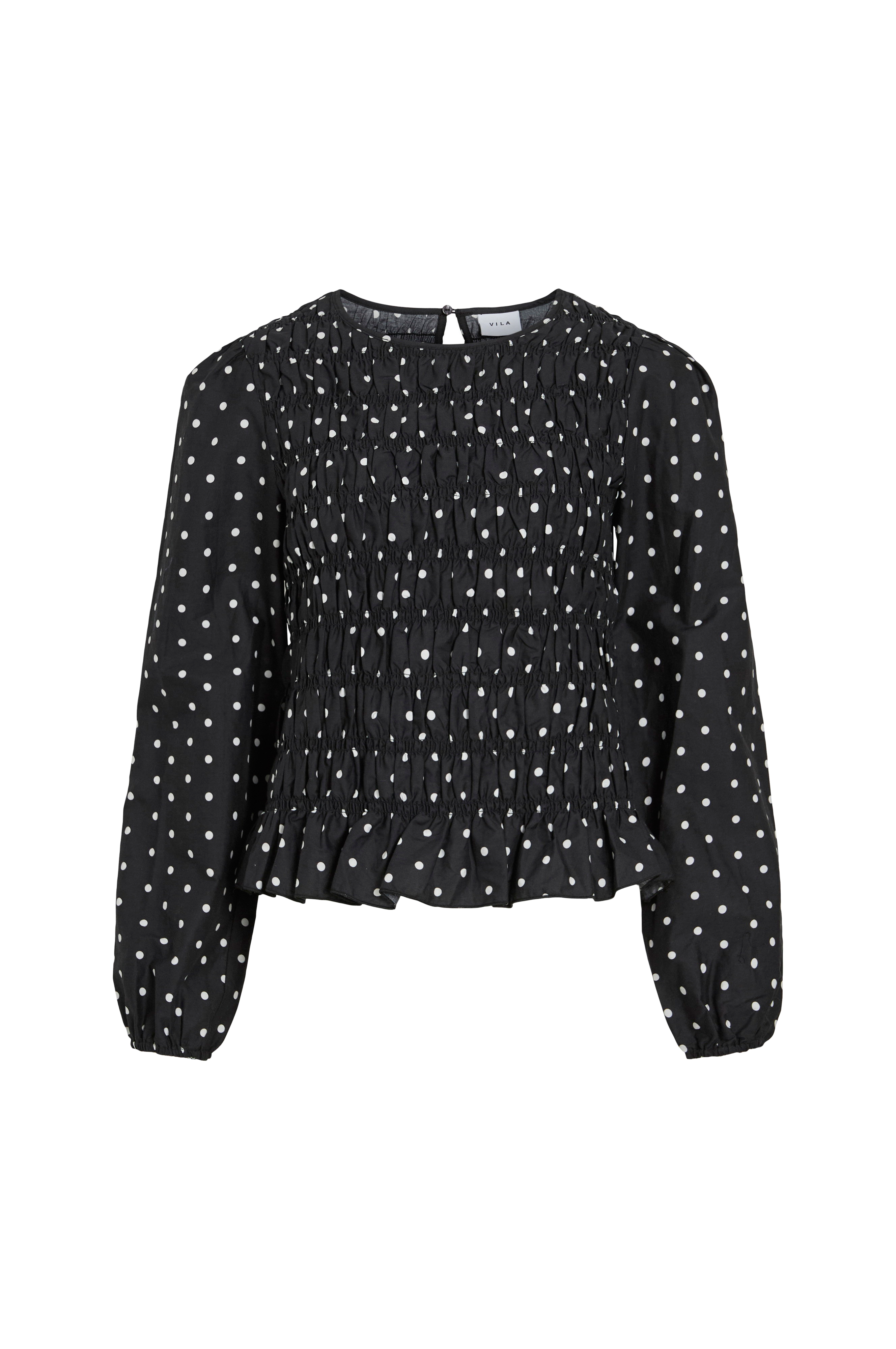 • Bluse med en smock• Rund halsudskæring med knap i nakken• Lange pufærmer med elastisk ærmeafslutning