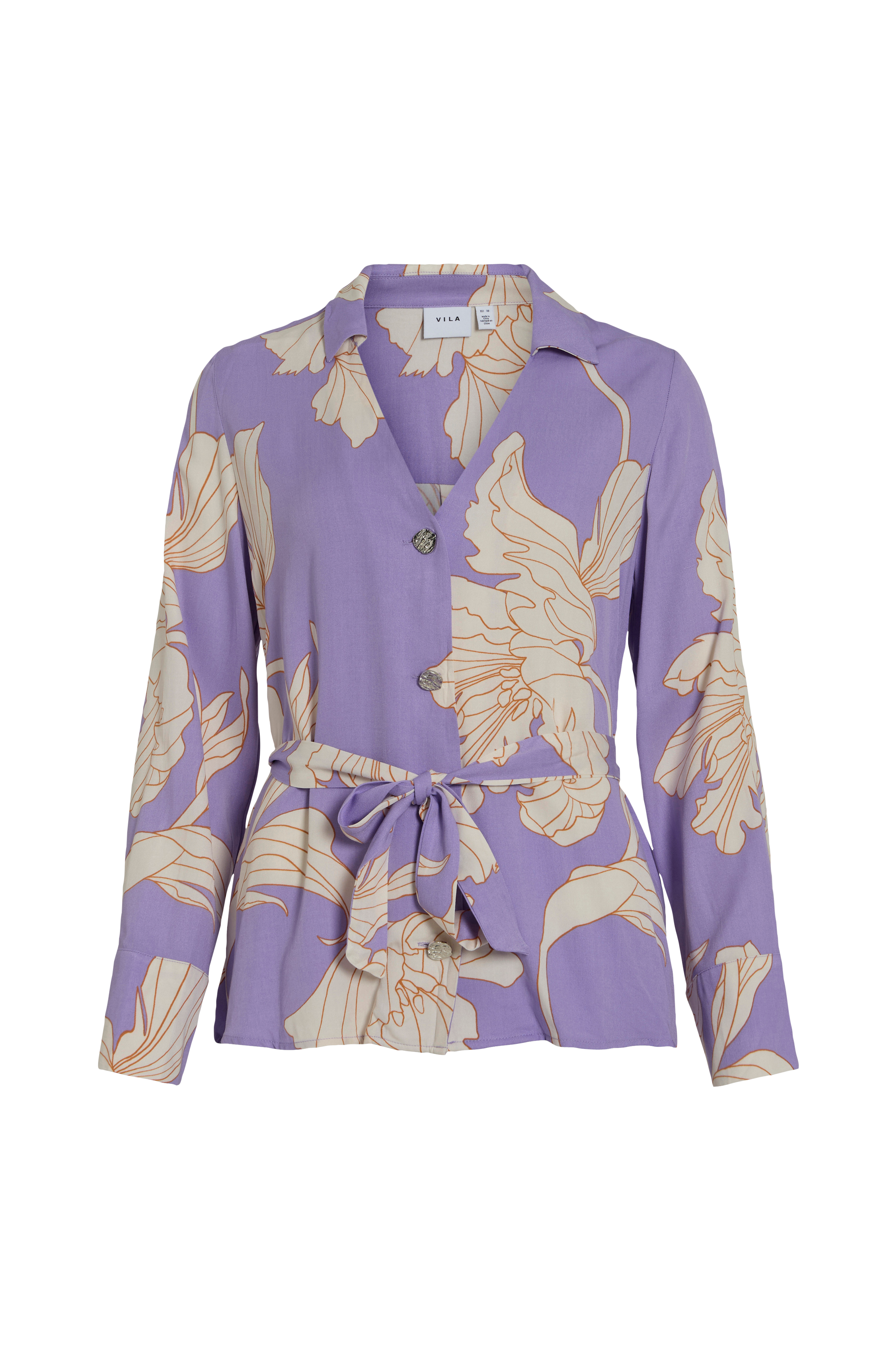 • Model med bindebælte ved taljen• Lille krave• V-udskæring• Dekorative, sølvfarvede knapper foran• Let udsvingende ærme med bred manchet