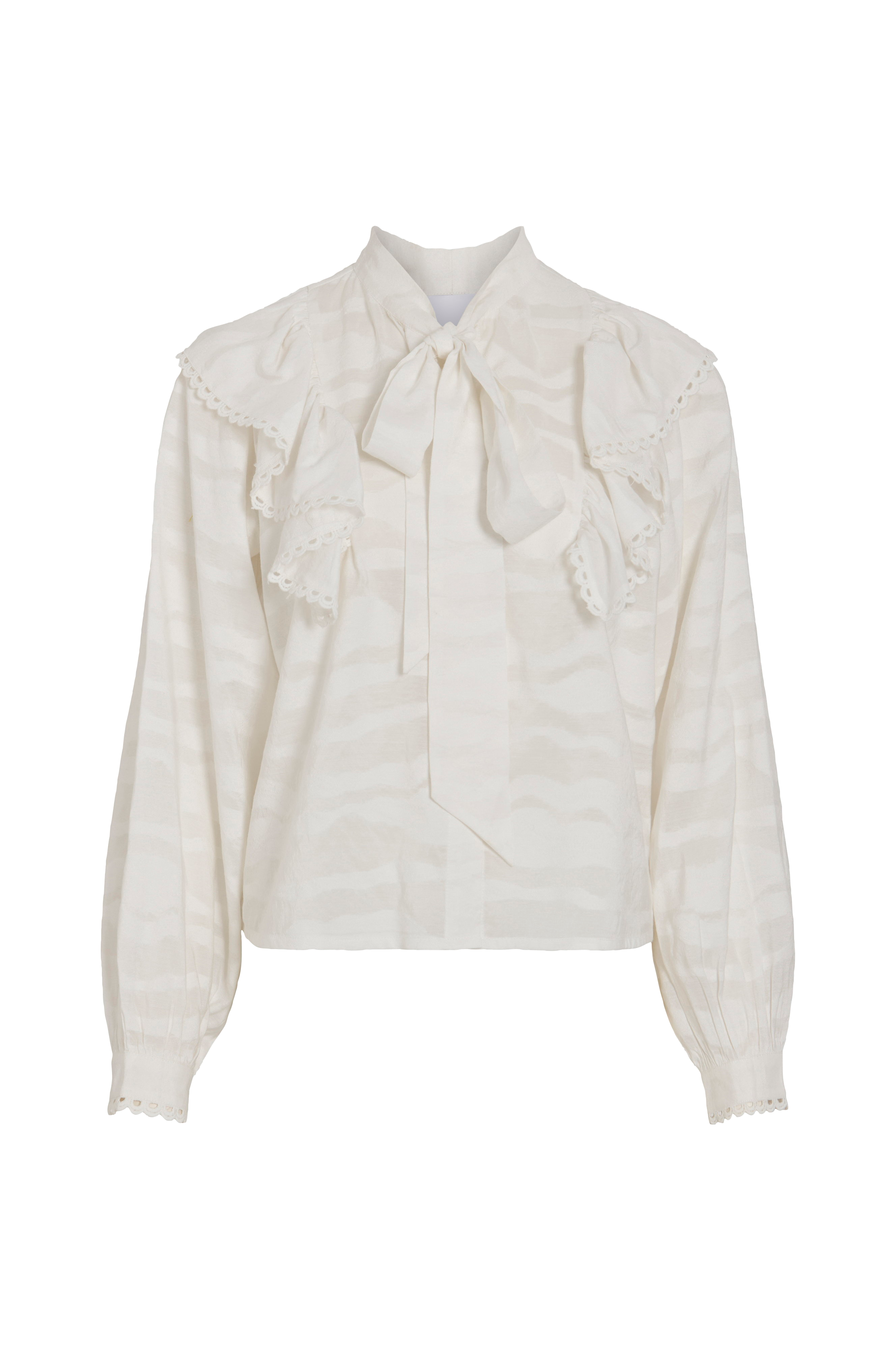 • Semitransparent bluse med volanter over skuldrene• Bindebånd på udskæringen• Lange pufærmer• Manchet ved manchetterne• Dekorative detaljer• Knapstolpe hele vejen frem• Normal pasform