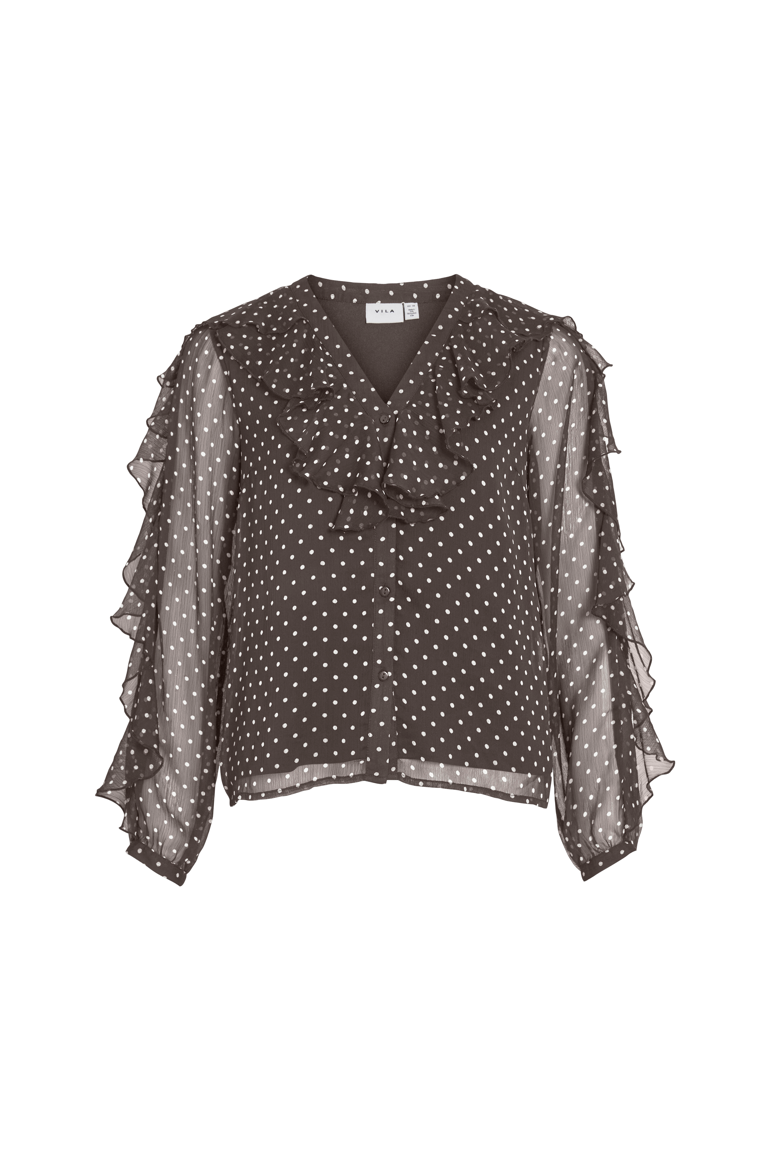 • Bluse i chiffon med trikotfor• V-formet halsudskæring• Volant rundt om halsen og langs ærmerne• Lange, uforede ærmer med tynde manchetter• Knapstolpe foran