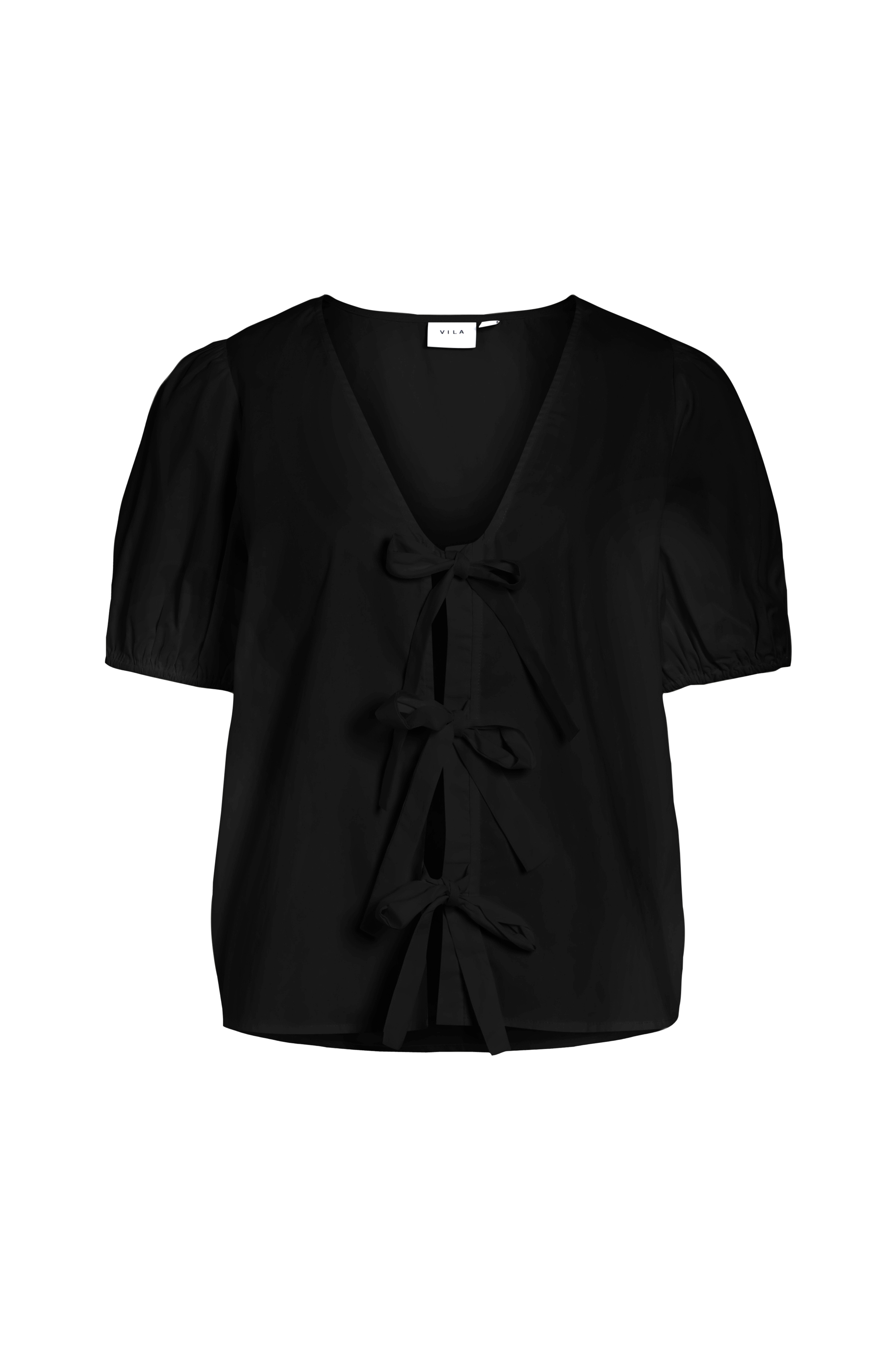 • V-formet halsudskæring• Tre bindebånd foran• Kort ballonærme med elastik ved manchetterne