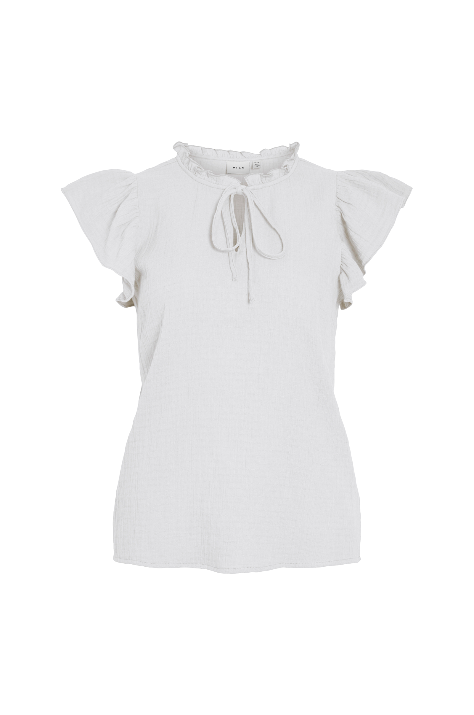 • Bluse i bomuld• Rund halsudskæring med flæsekant• Slids med bindebånd foran• Korte flagrende ærmer