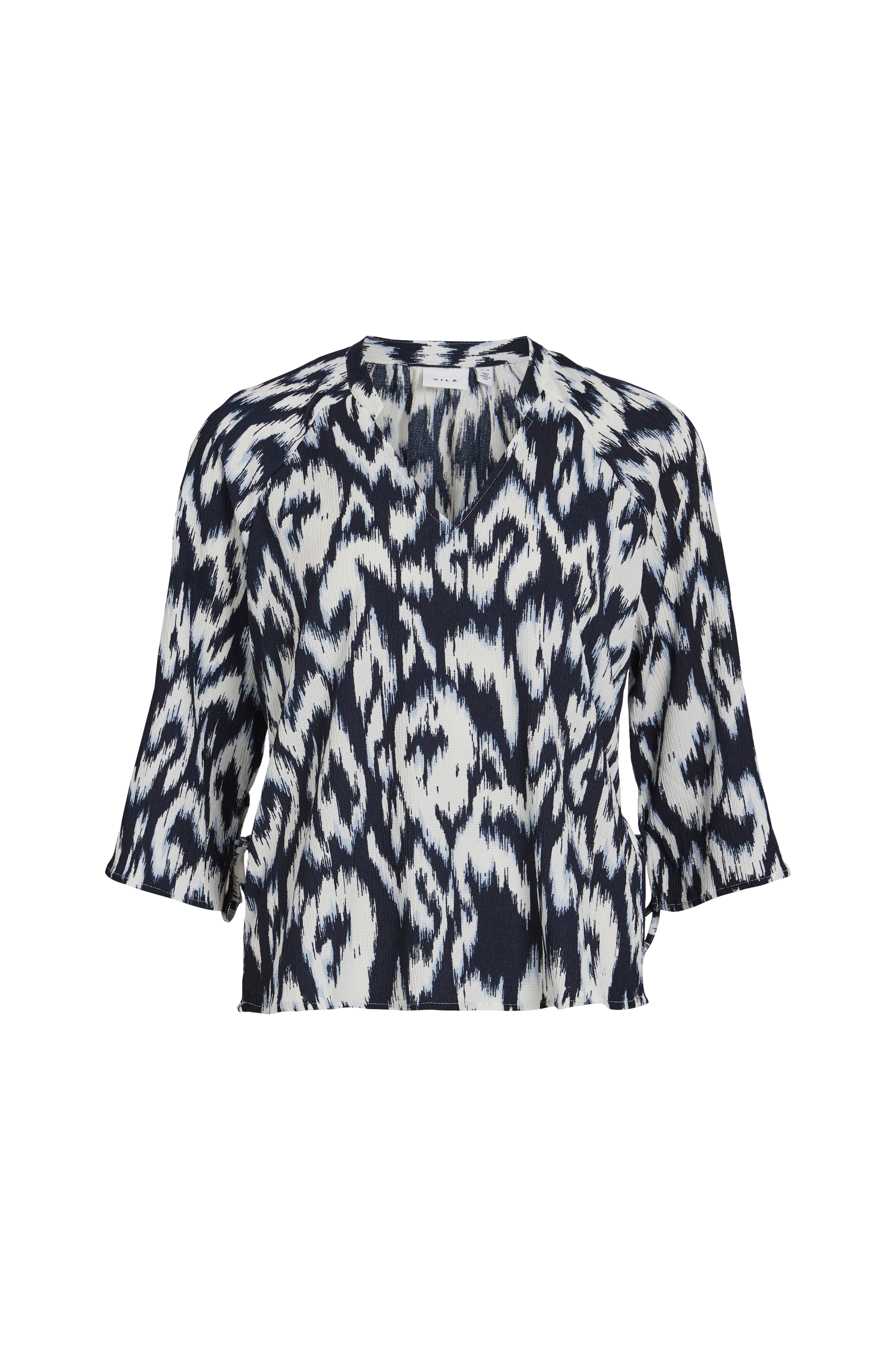 • V-udskæring• 3/4 lange raglanærmer med bindebånd ved ærmeafslutningerne• Kreppet kvalitet