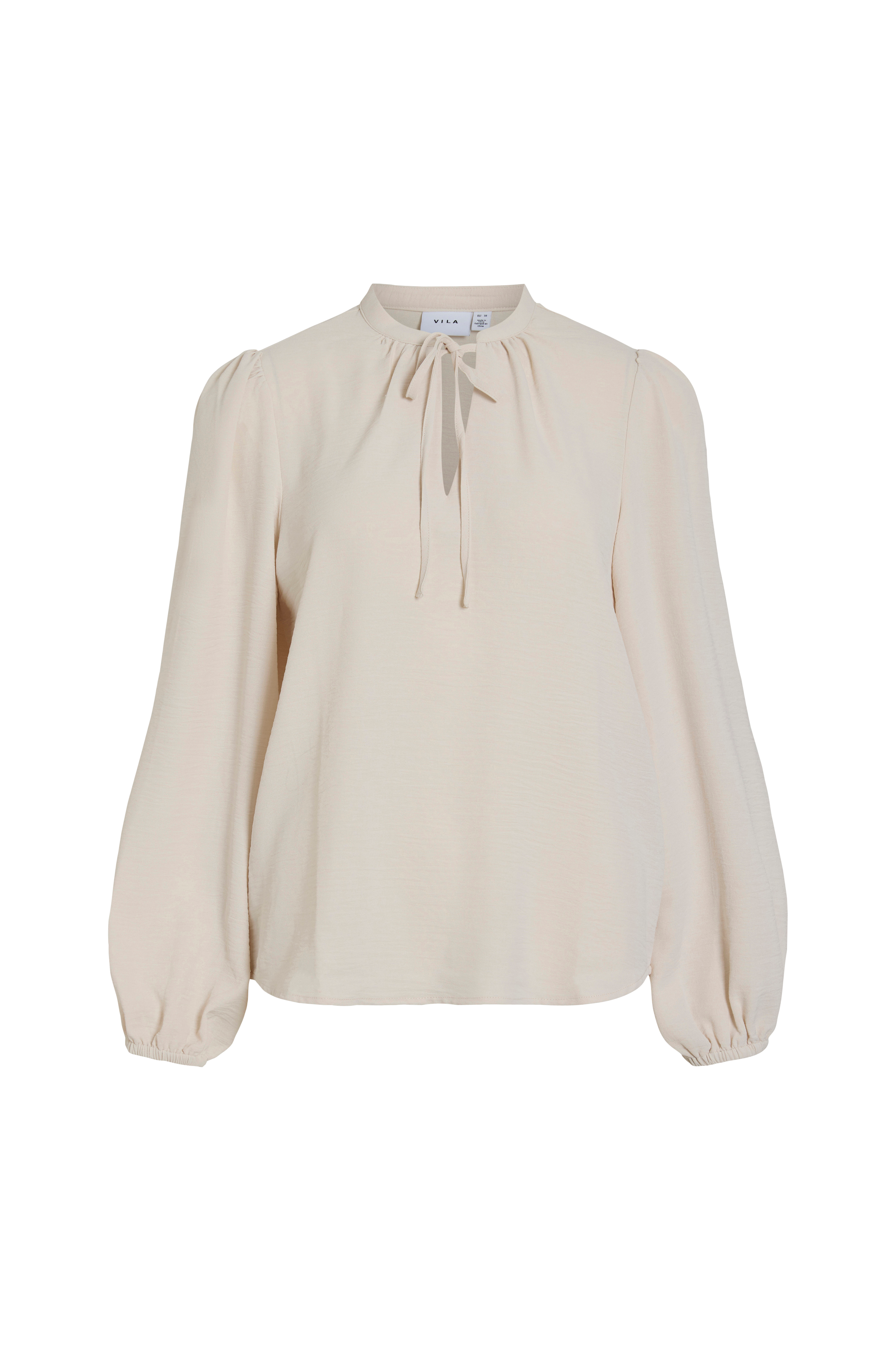 • Lige model• Rund hals med v-udskæring og bindebånd foran• Langt ballonærme med elastik ved manchetterne• Let afrundet søm
