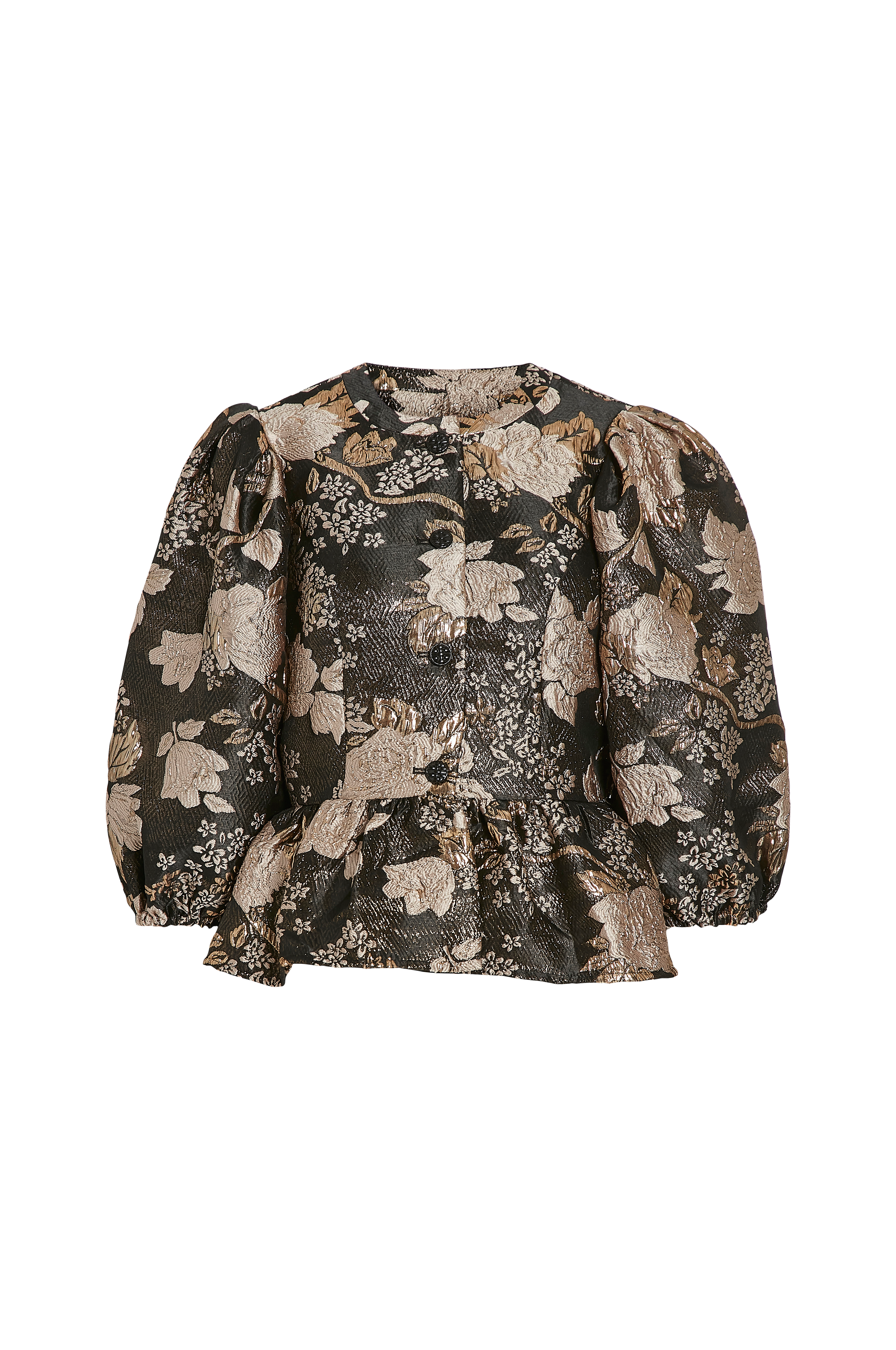• Jacquardvævet, glitrende peplumdesign• Defineret talje med vidde nederst• Rund hals• Knapper foran• 3/4 langt ballonærme med elastik ved manchetterne