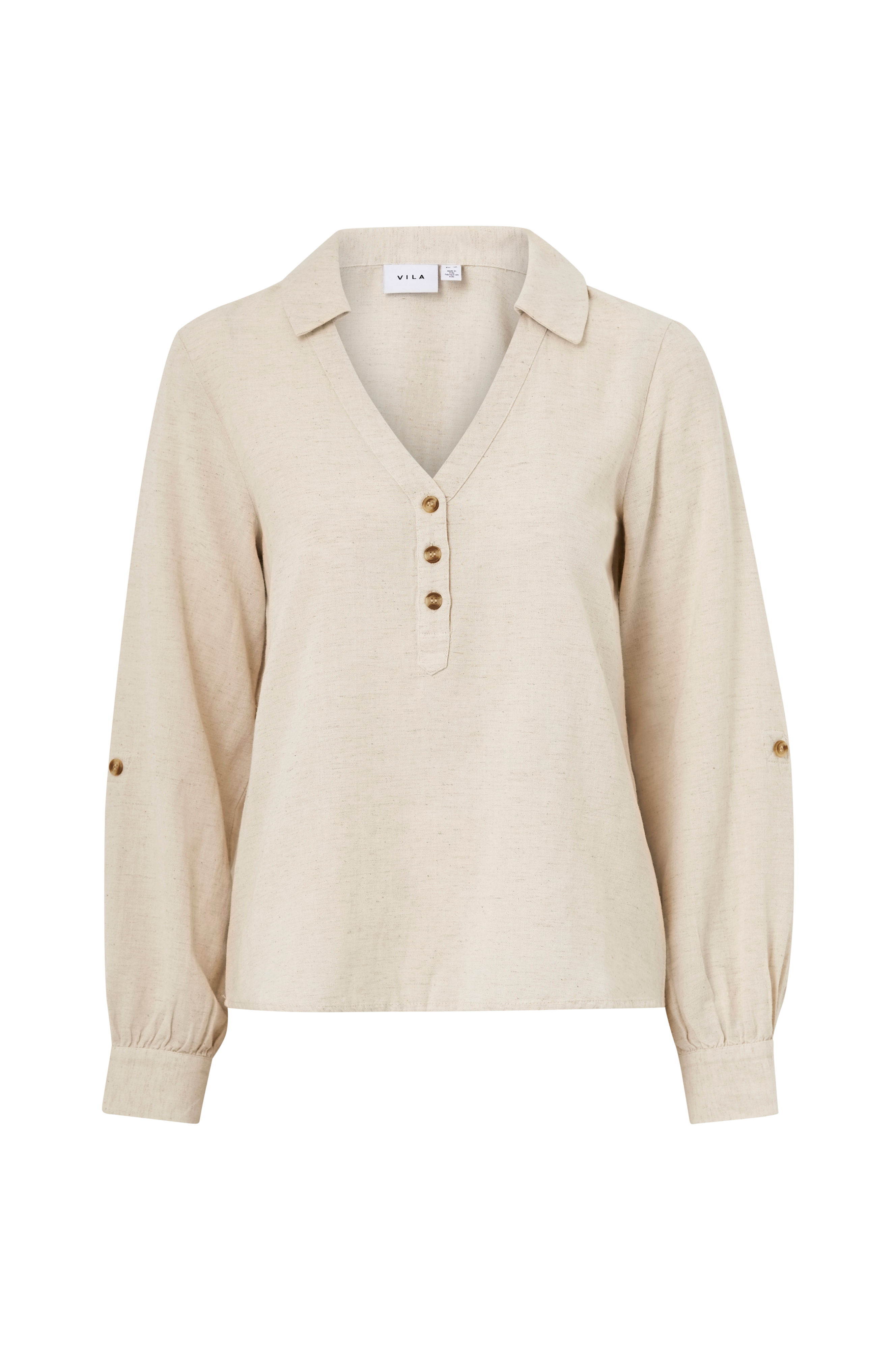• V-udskæring med krave• Knapper oppe foran• Lange ærmer med knap til oprulning• Fremstillet af hørblanding