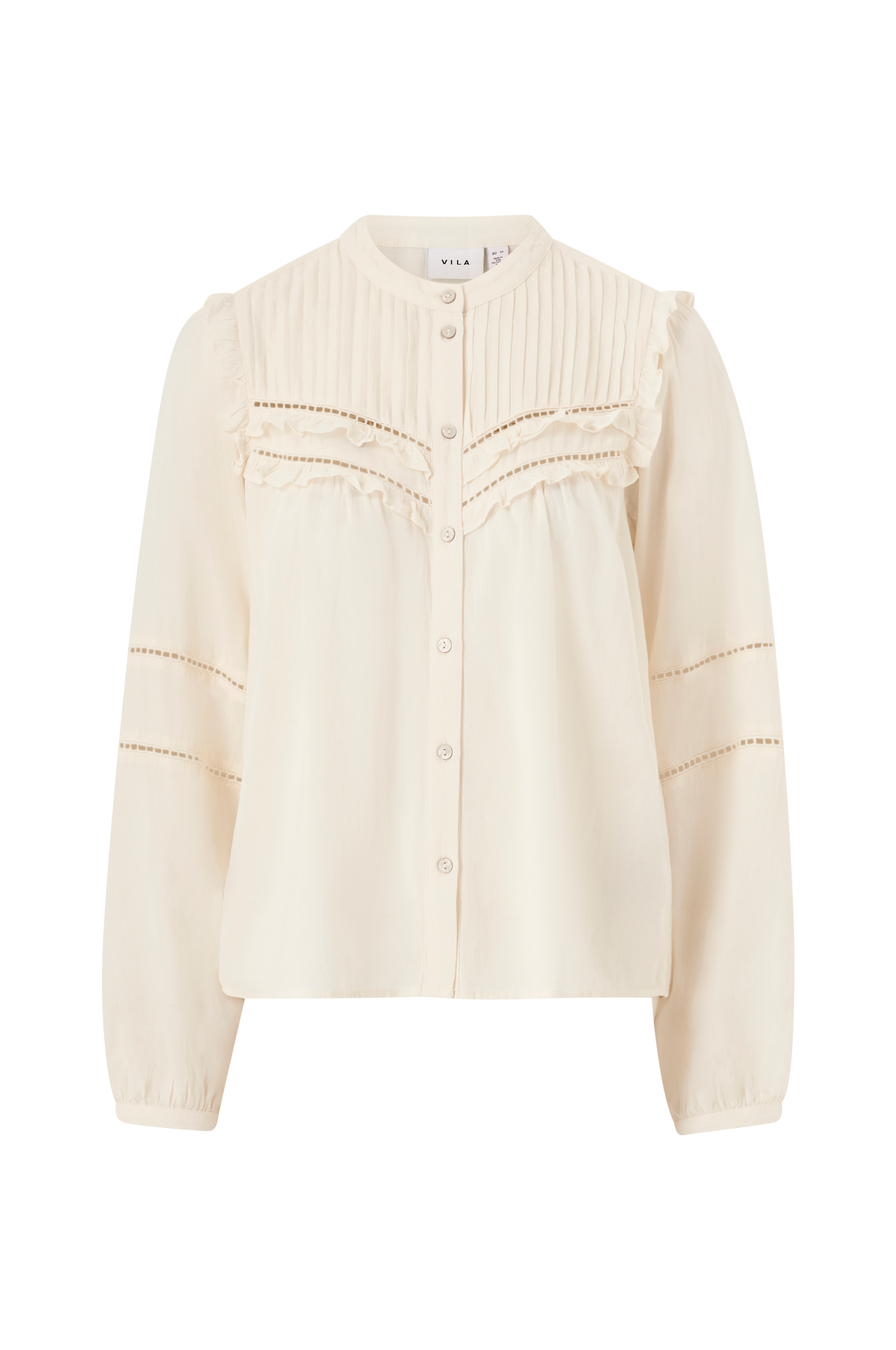 • Knapper foran• Syede biselæg oppe foran• Volanter ved brystet og på hver skulder• Ballonærmer med tynd manchet
