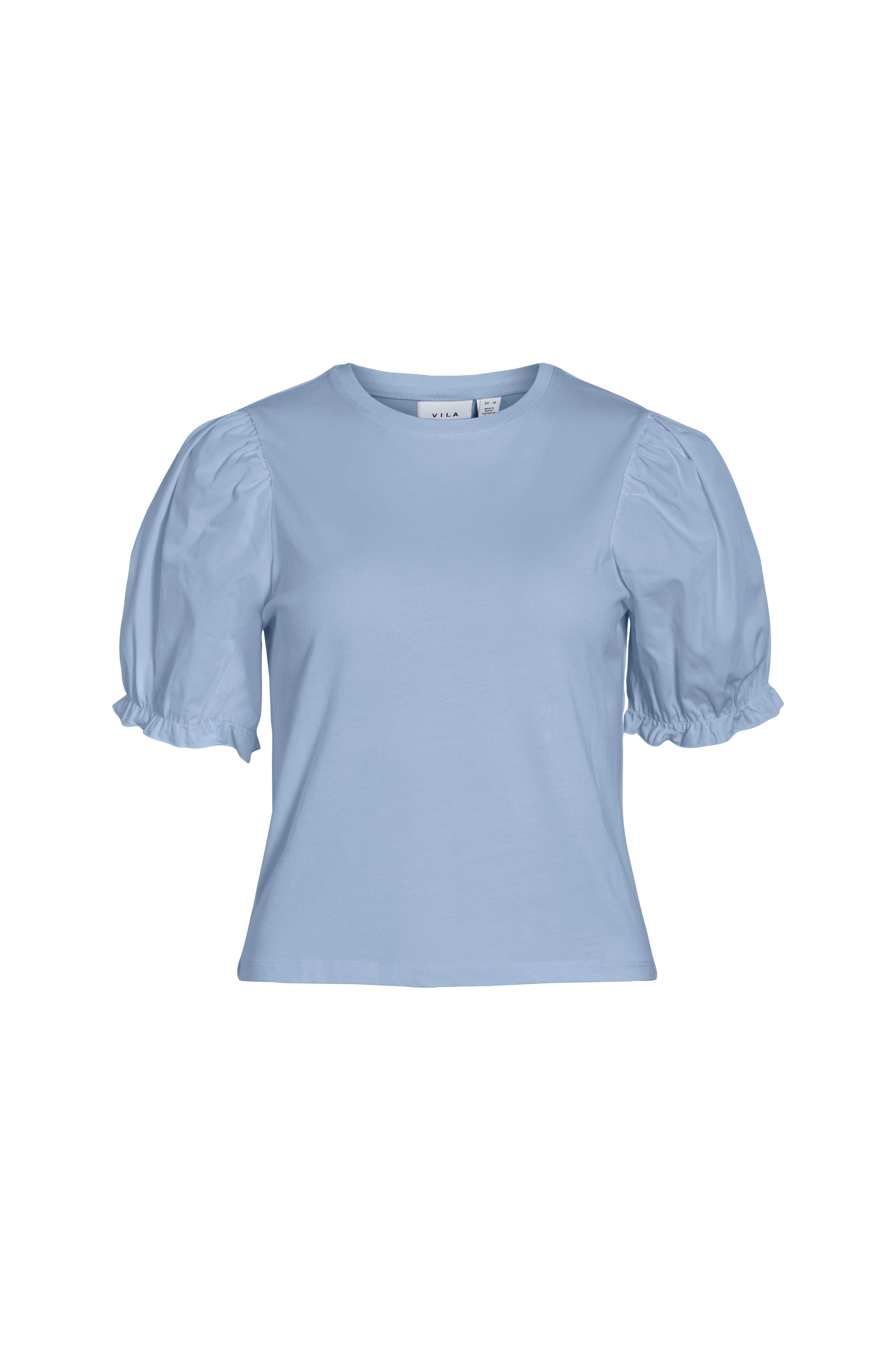 • Lige, kort model• Rund halsudskæring• Ballonærmer med volant• Elastik ved manchetterne