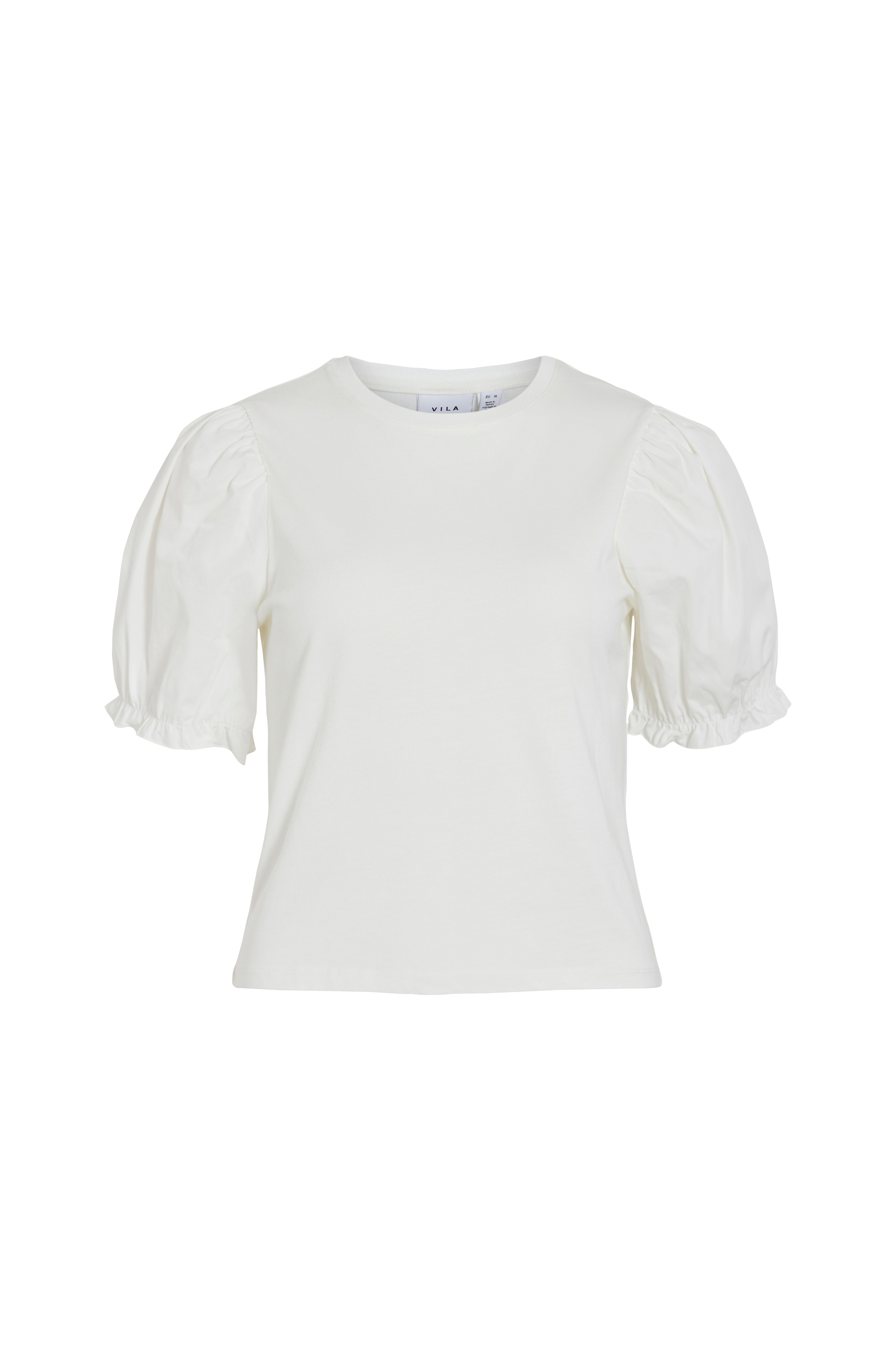 • Lige, kort model• Rund halsudskæring• Ballonærmer med volant• Elastik ved manchetterne