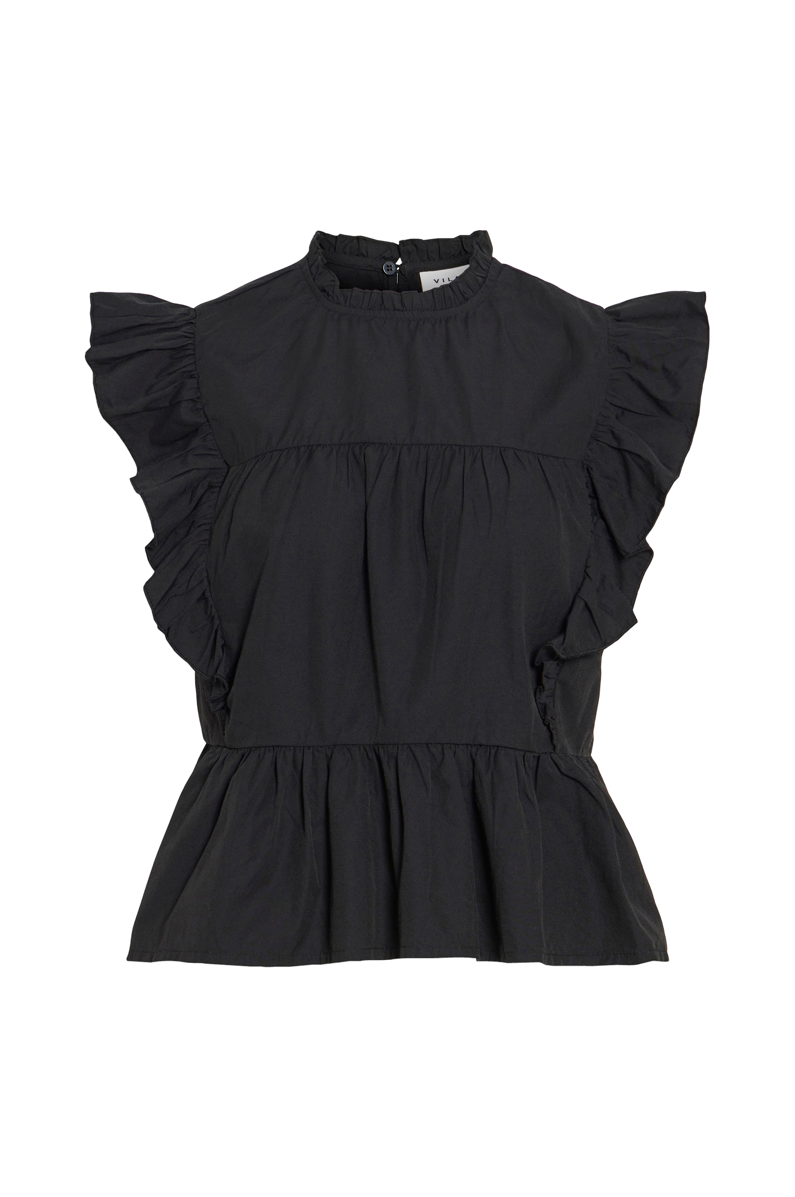 • Ærmeløs bluse med volanter over skuldrene• Rund halsudskæring med flæsekrave• Nøglehulslukning i nakken• Volant nederst