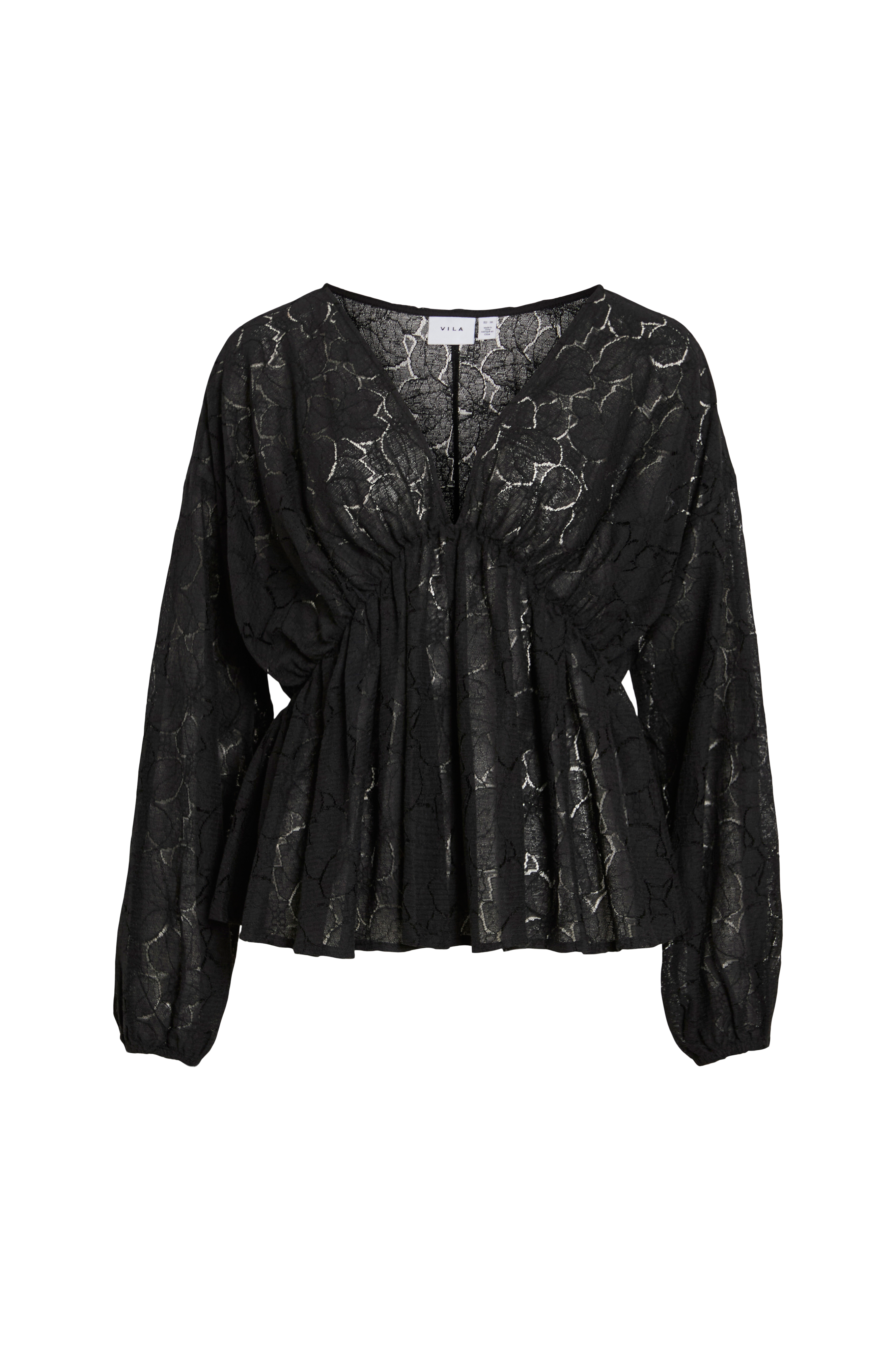• Figurformede model i blonde• Dyb v-udskæring• Indlagt elastik under brystet og bagpå ved taljen• Nedsænket skulder med langt ærme og elastik ved manchetterne