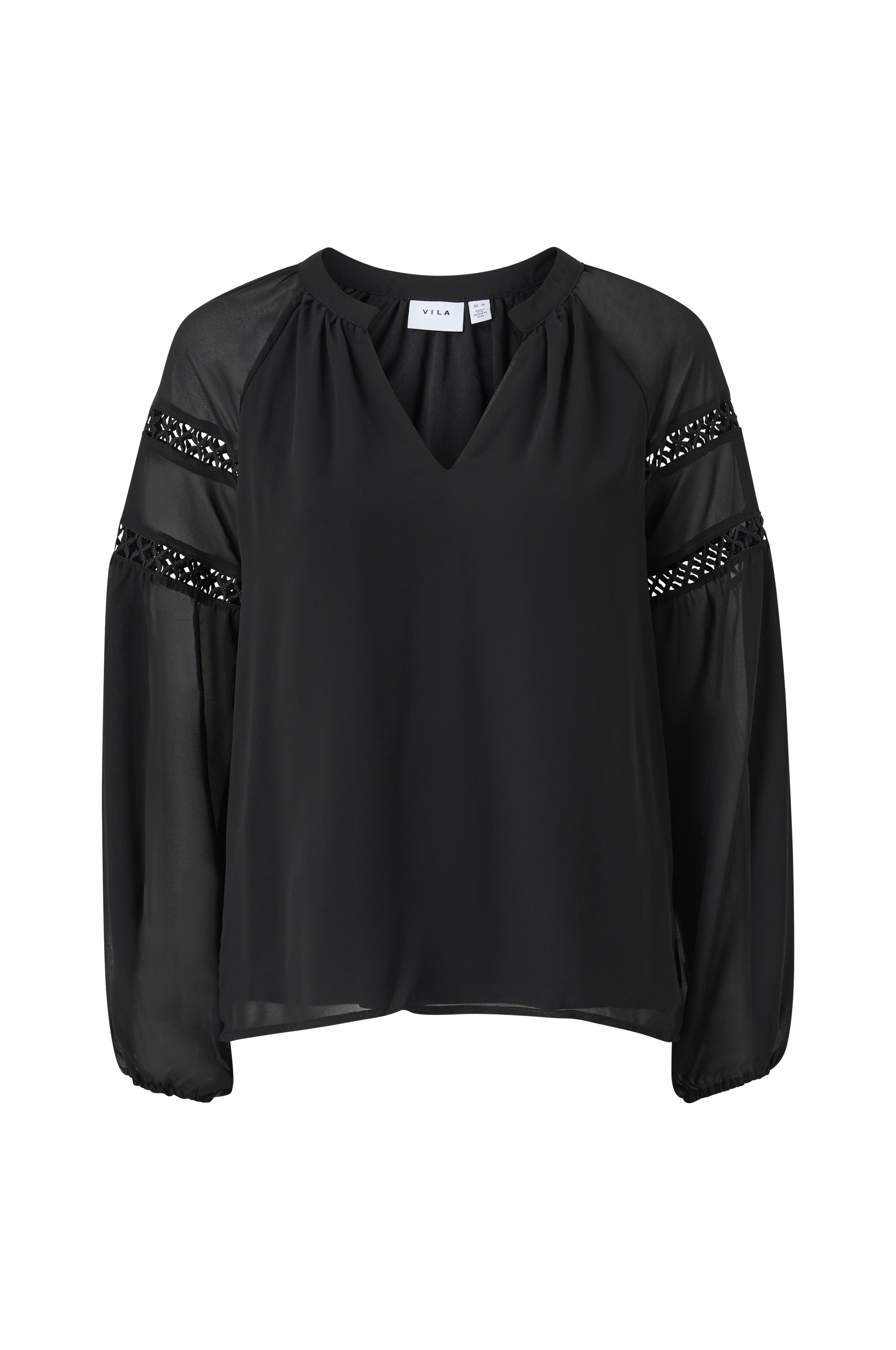 • V-udskæring• Ballonærmer med hulmønster nederst og elastik ved manchetterne• Fremstillet af chiffon• Trikotfor