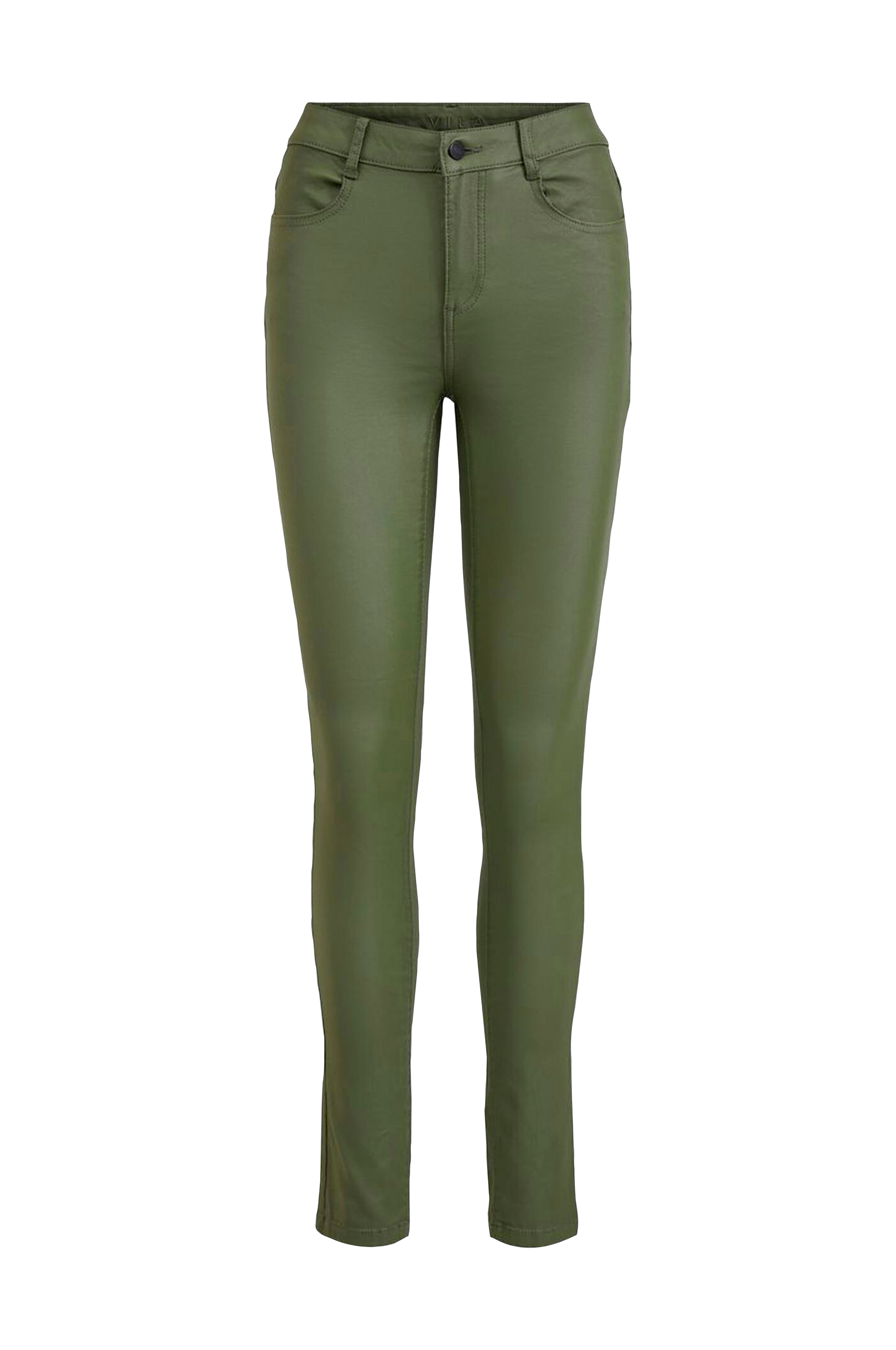 Buks viCommit New Coated fra Vila i smal model med meget stretch. Buksen har en såkaldt coated overflade som giver et lidt blankt, imiteret læder-look. To lommer foran og to baglommer. Gylp med lynlås og knap. Benlængde 79 cm i str. M.