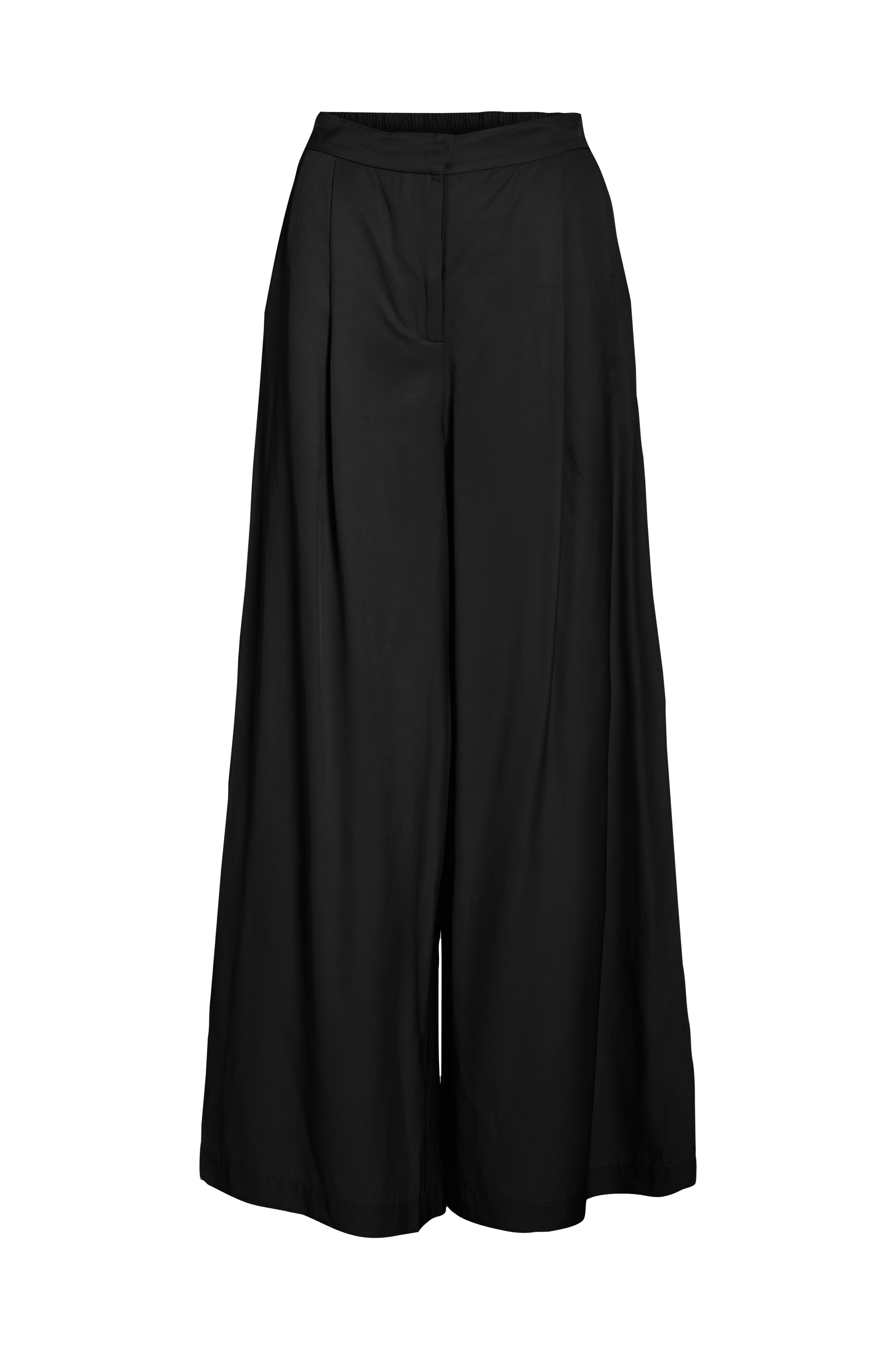 • Model med brede, lige ben• Høj talje• Linning med elastik bagpå• Gylp med lynlås• Skrå lommer foran• Snydelommer bagpå• Indre benlængde: 77 cm i størrelse 36
