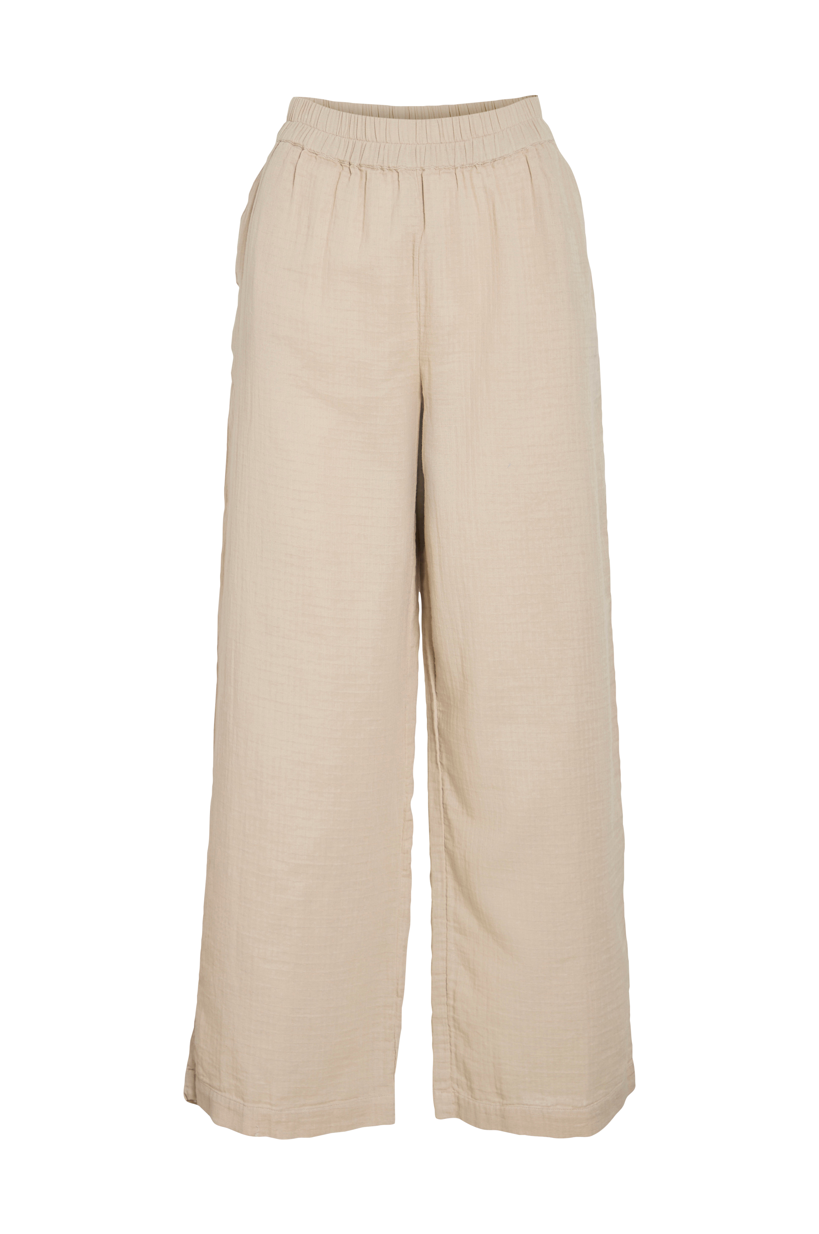 • Bukser i vævet, let bomuld• Stof med let strukturmønster• Løs pasform• Brede ben• Elastisk talje• Sidelommer• Indre benlængde: 74 cm i størrelse 38