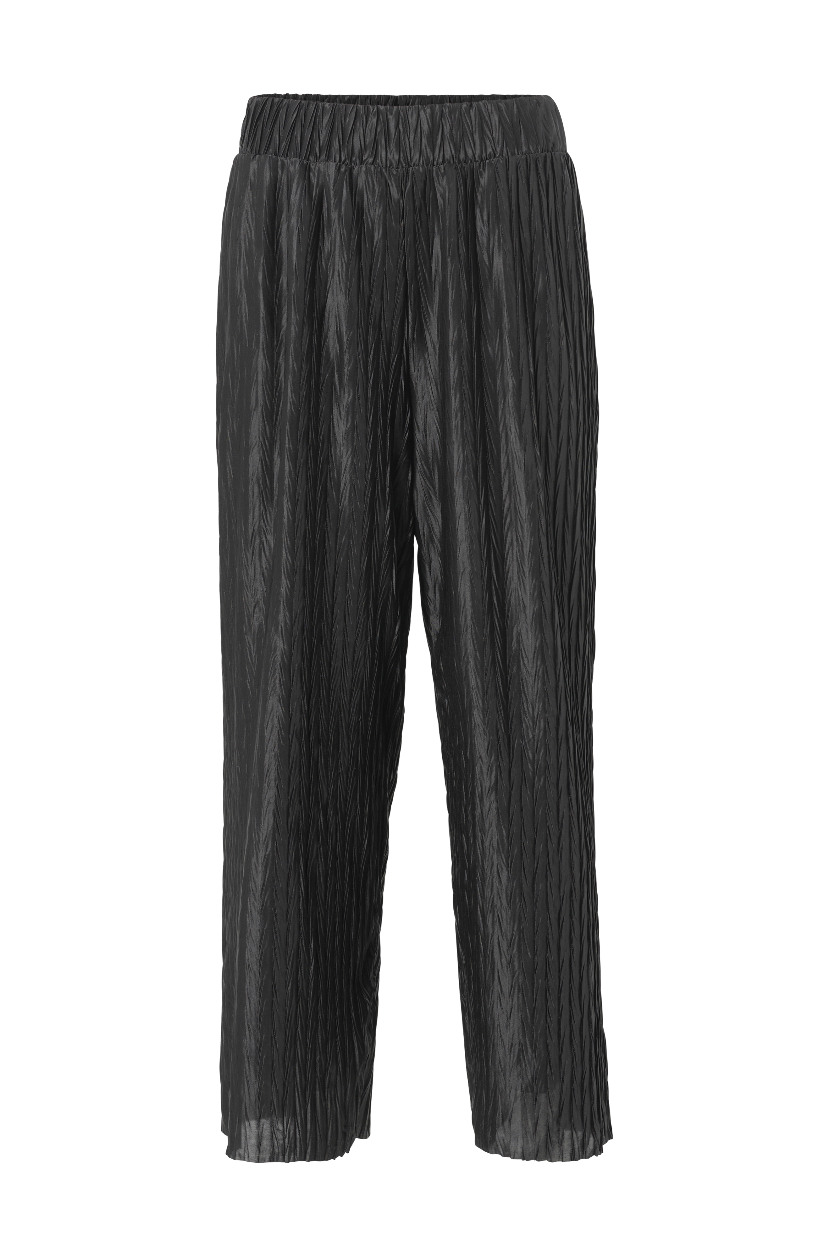 Bukser i strukturmønstret kvalitet med vide, lige ben som slutter ved anklen. Påsyet linning med bred, indsat elastik. Forede. Indvendig benlængde ca. 65 cm i str. S.