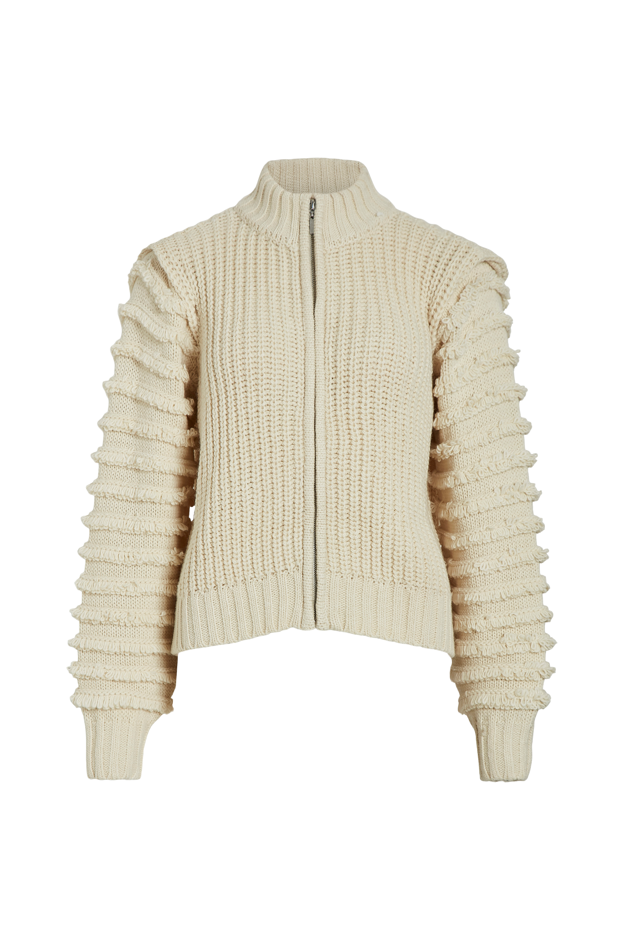• Grovstrikket model med strukturstrikkede ærmer• Halvhøj, ribstrikket krave• Lynlås foran• Ribstrik nederst og ved manchetterne