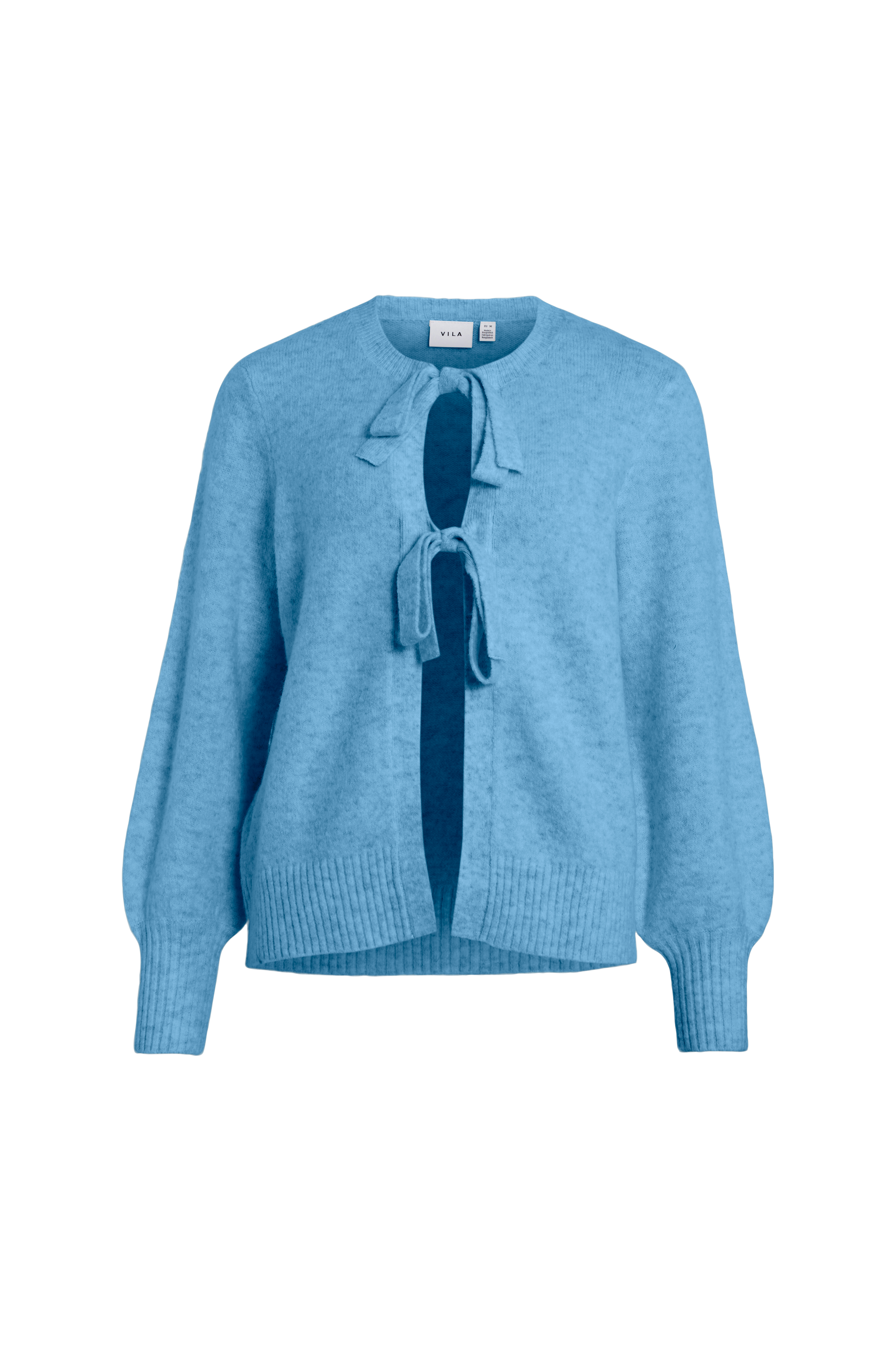 • Lige model• Rund hals med ribstrik• Strikkede bindebånd foran• Langt ærme med ribmanchet• Ribstrik ved nederste kant