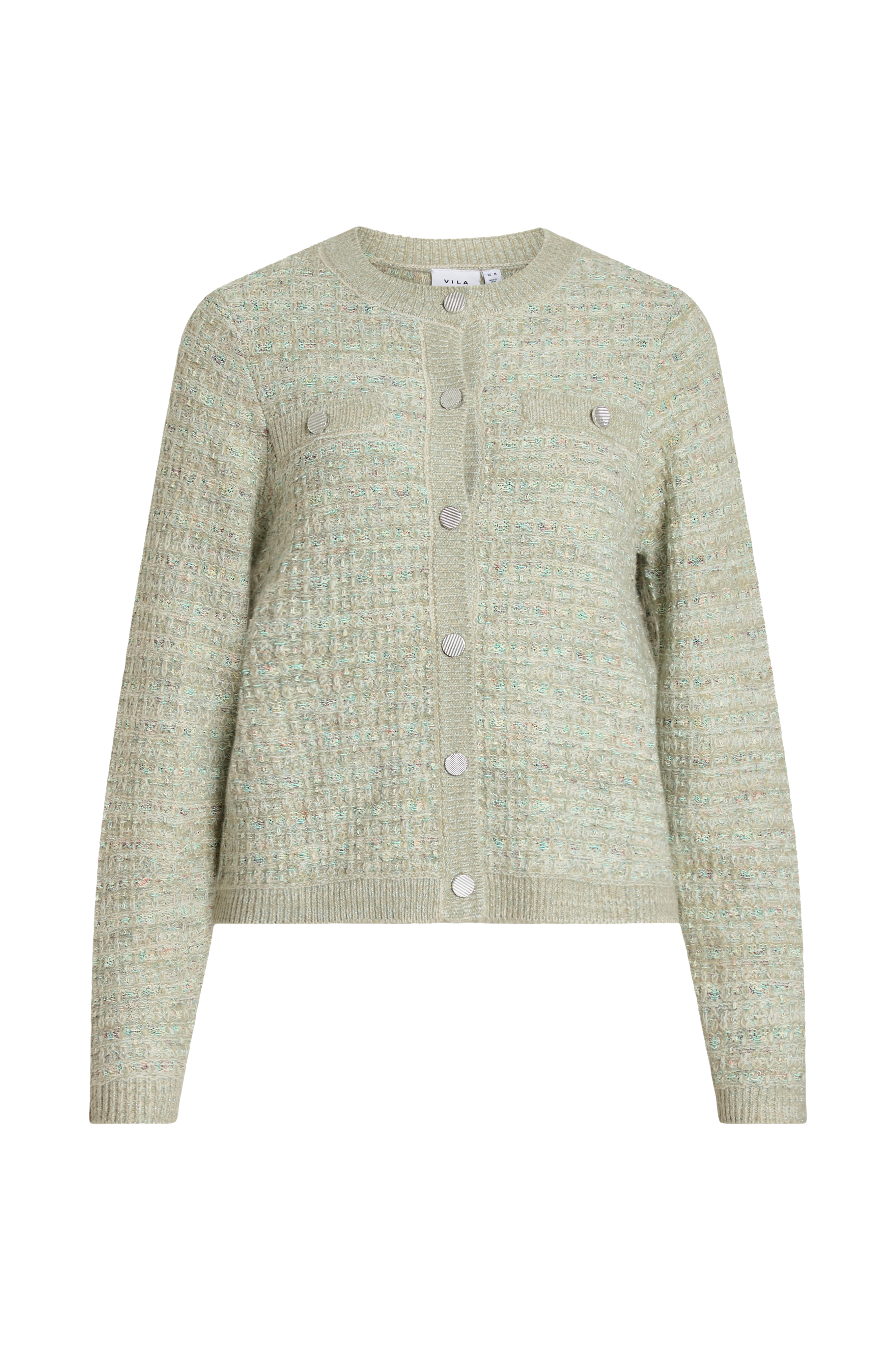 • Fintstrikket cardigan med glimmertråd• Rund, ribstrikket halsudskæring• Sølvagtige knapper foran• Snydelommer• Ribstrik ved manchetterne og ved nederste kant