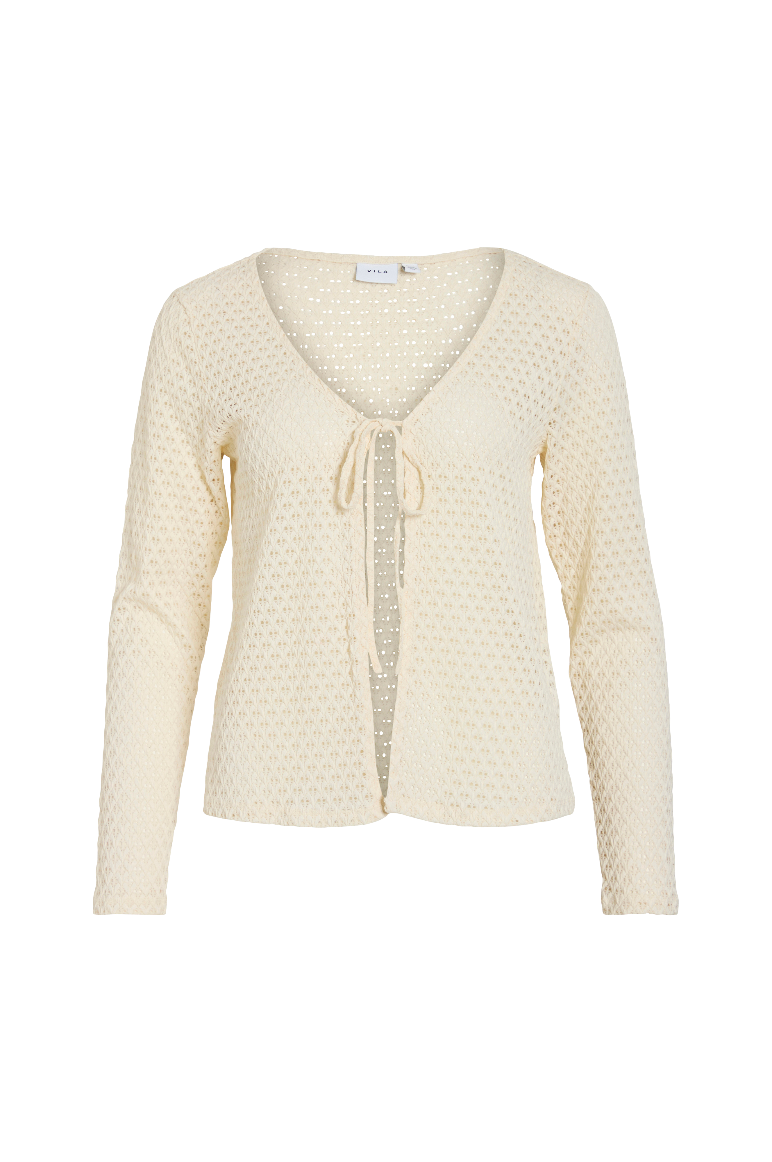 • Mønsterstrikket model• V-formet halsudskæring• Bindebånd oppe foran• Langt ærme