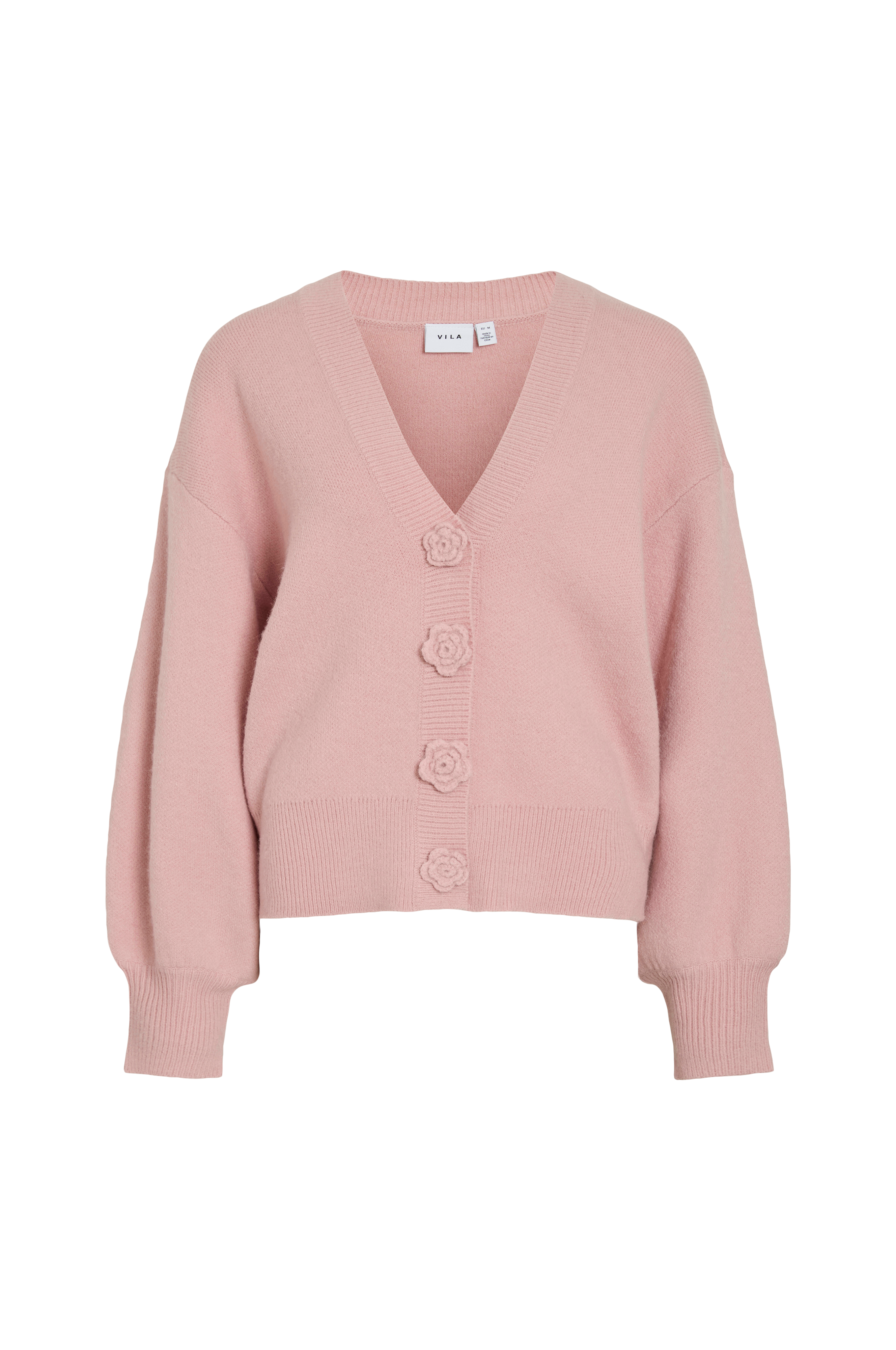 • Fintstrikket cardigan med v-formet, ribbet halsudskæring• Lange ballonærmer med nedsænkede skuldre og ribmanchetter ved manchetterne• Dekorative trykknapper med roser foran• Ribstrik ved nederste kant