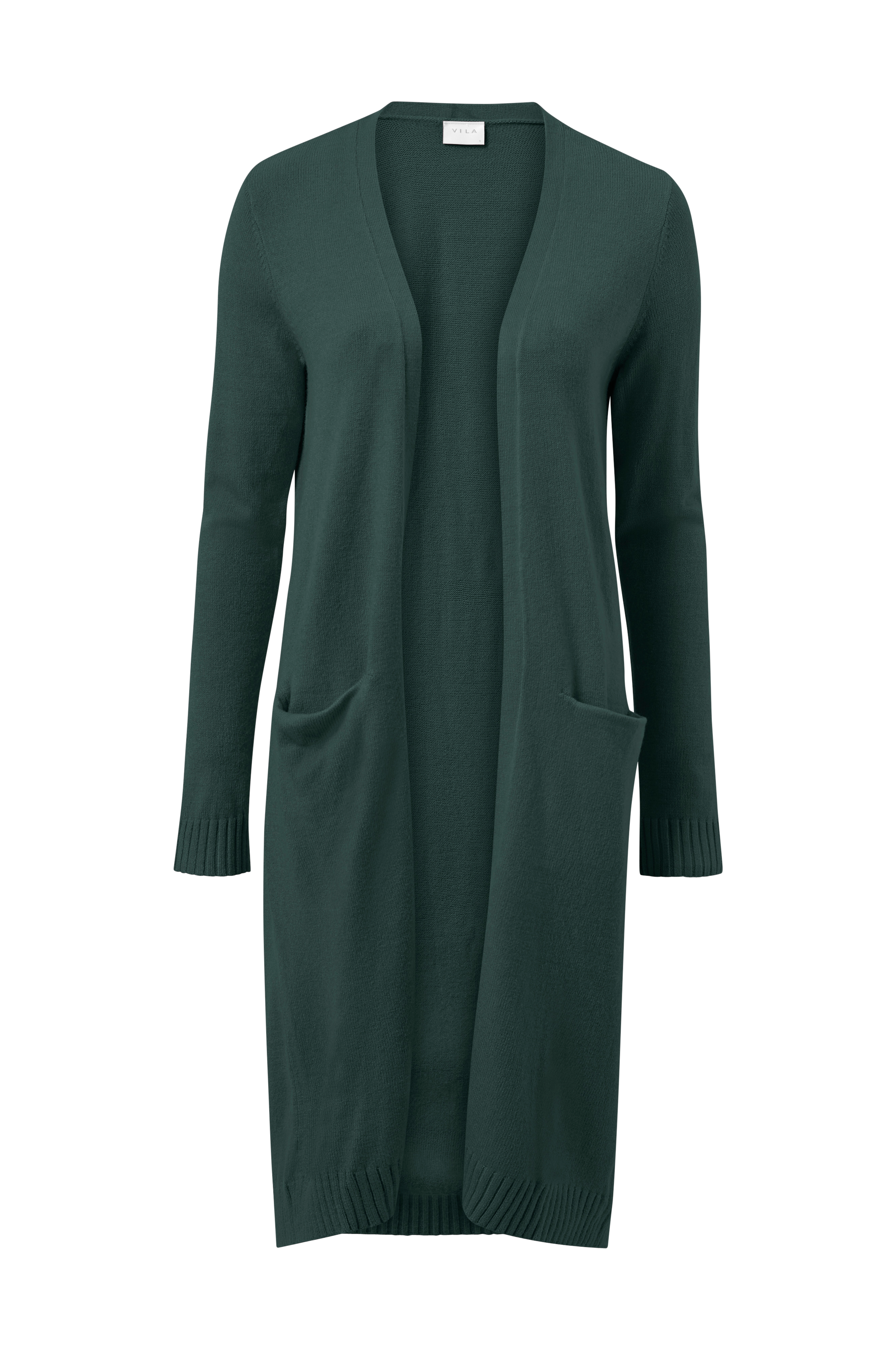 Cardigan viRil L/S Long Knit fra Vila er i lang, skøn model som er glatstrikket i blødt garn. To forlommer. Ribstrikkede kanter i ærmekanter og forneden. Længde bagpå ca. 108 cm i M.