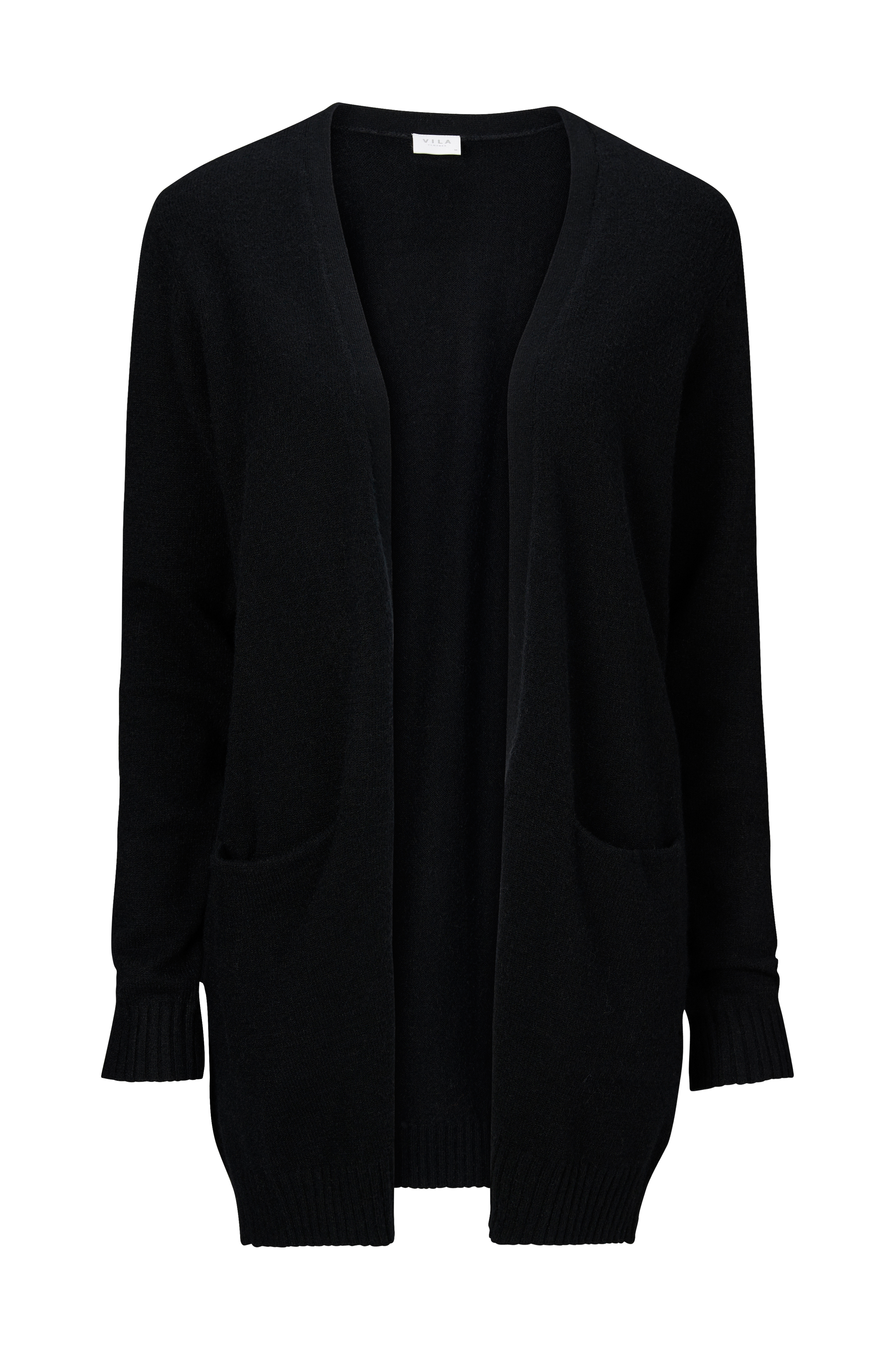 Cardigan viRil L/S Open Knit fra Vila. Lang, flot model uden lukning med indvævet kant foran. To indsatte lommer og groftribbet kant i ærmekanten og forneden. Længde ca. 84 cm i str. M.