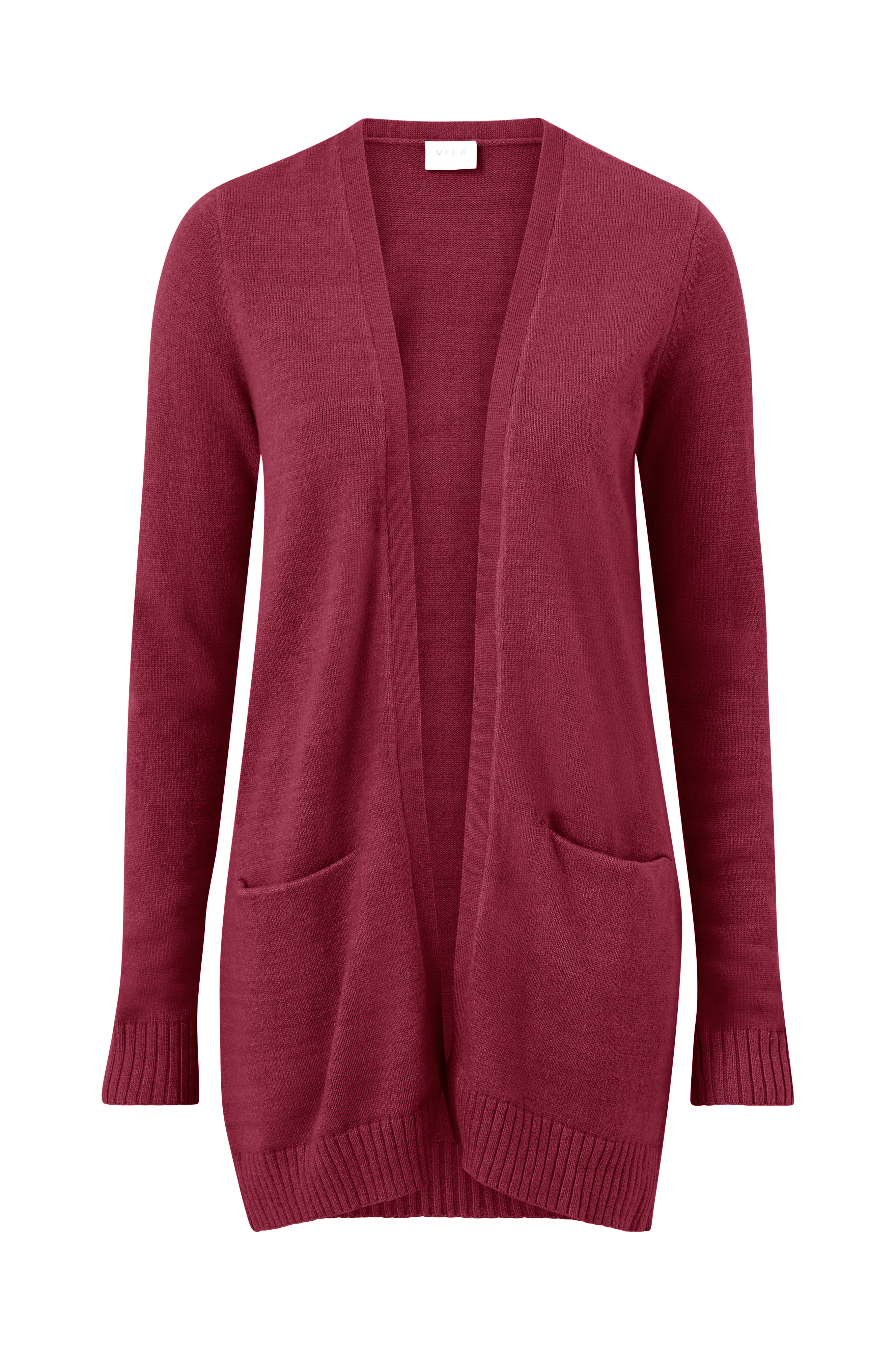 Cardigan viRil L/S Open Knit fra Vila. Lang, flot model uden lukning med indvævet kant foran. To indsatte lommer og groftribbet kant i ærmekanten og forneden. Længde ca. 84 cm i str. M.