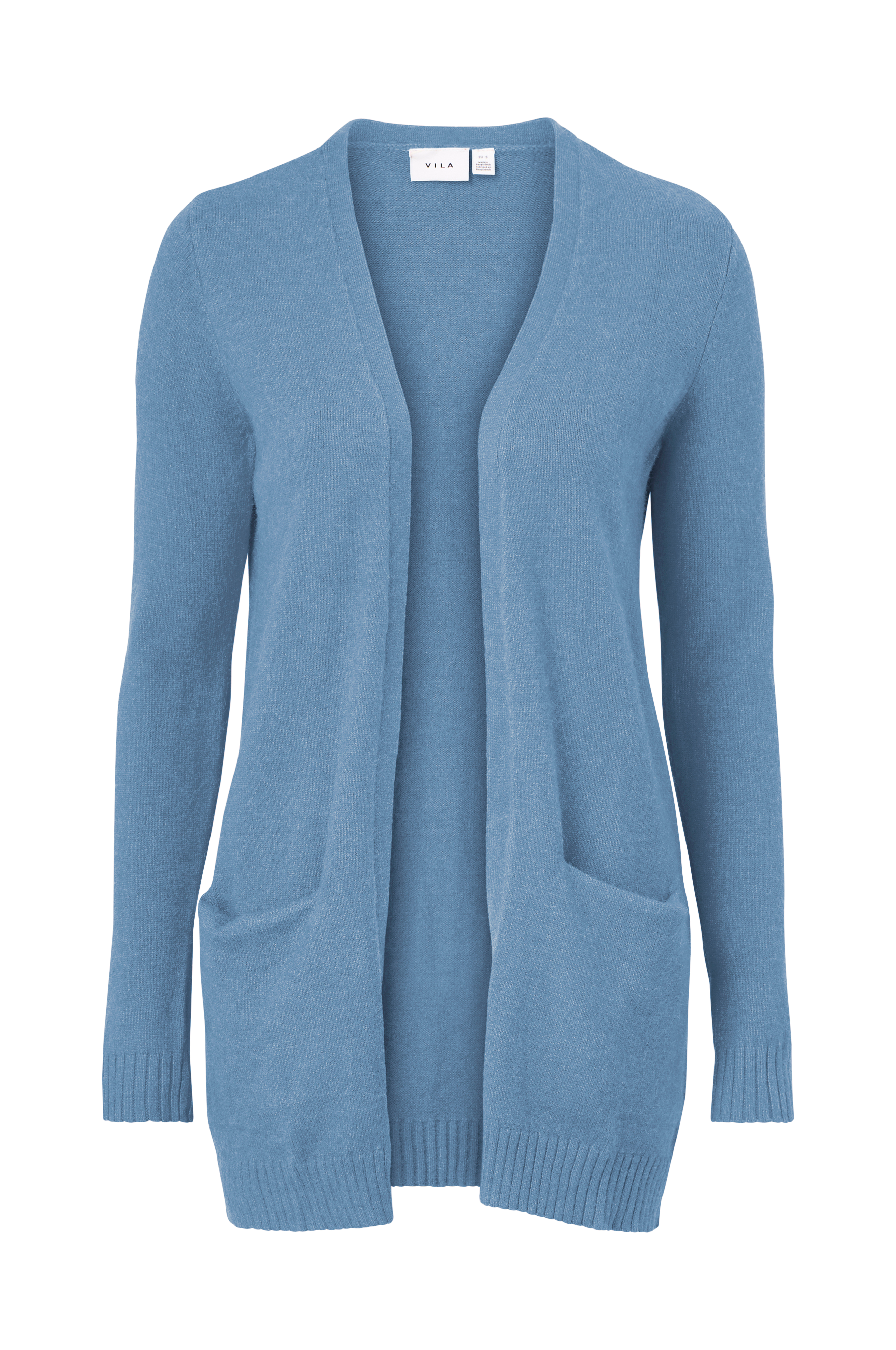 Cardigan viRil L/S Open Knit fra Vila. Lang, flot model uden lukning med indvævet kant foran. To indsatte lommer og groftribbet kant i ærmekanten og forneden. Længde ca. 84 cm i str. M.