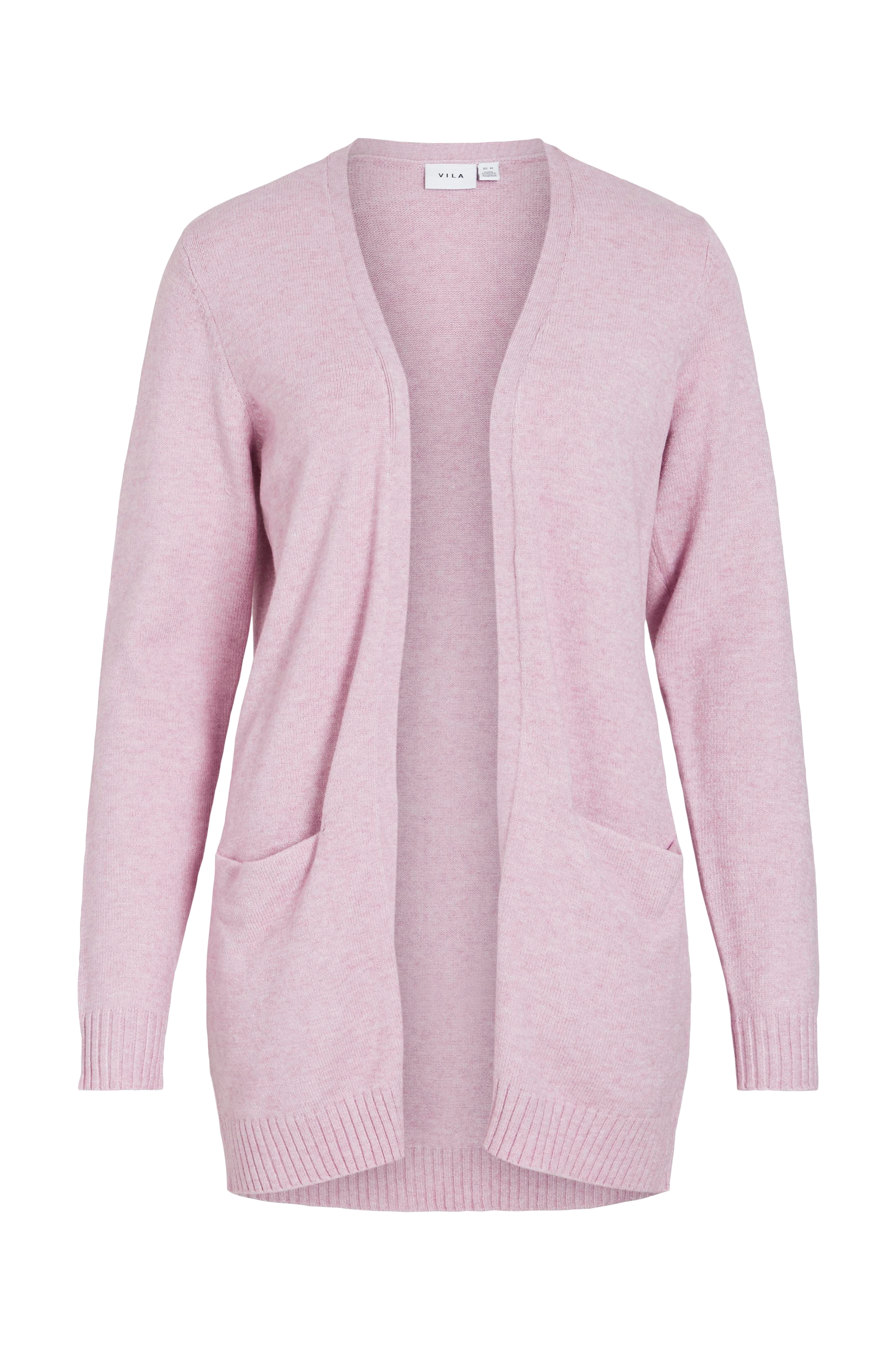 Cardigan viRil L/S Open Knit fra Vila. Lang, flot model uden lukning med indvævet kant foran. To indsatte lommer og groftribbet kant i ærmekanten og forneden. Længde ca. 84 cm i str. M.