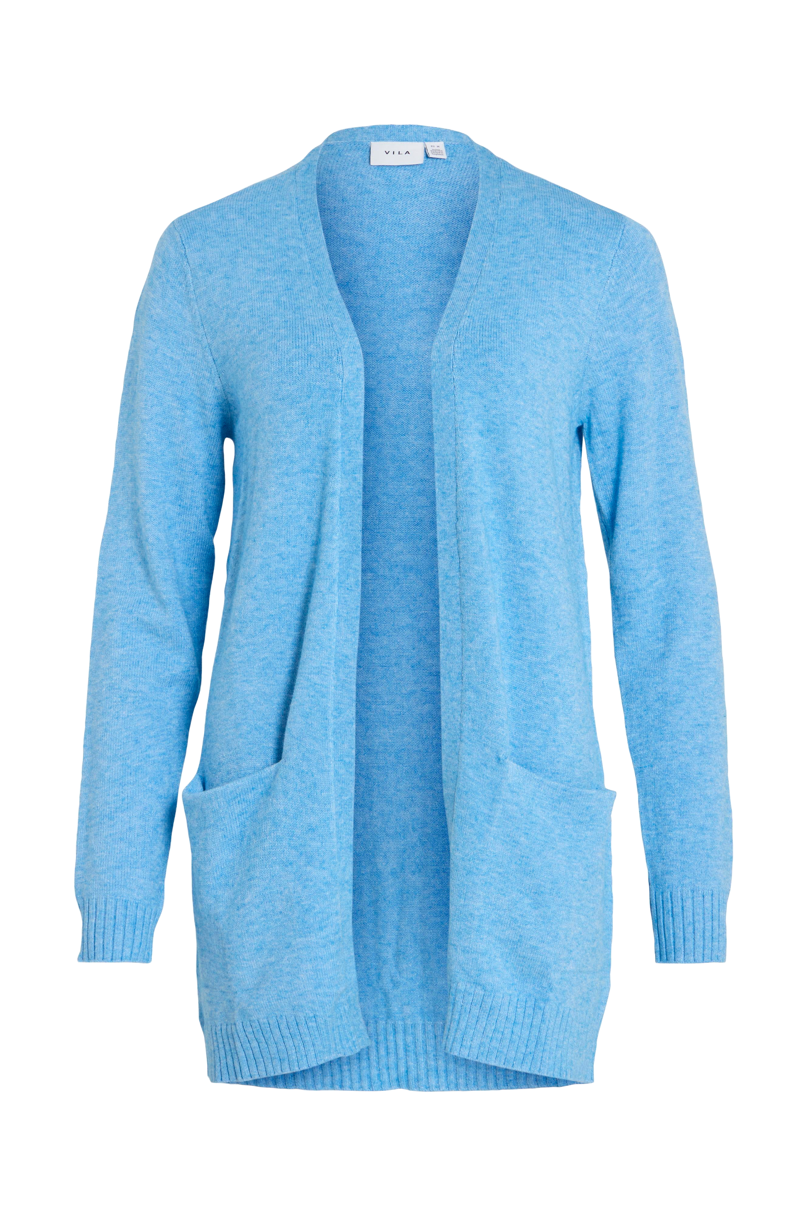 Cardigan viRil L/S Open Knit fra Vila. Lang, flot model uden lukning med indvævet kant foran. To indsatte lommer og groftribbet kant i ærmekanten og forneden. Længde ca. 84 cm i str. M.