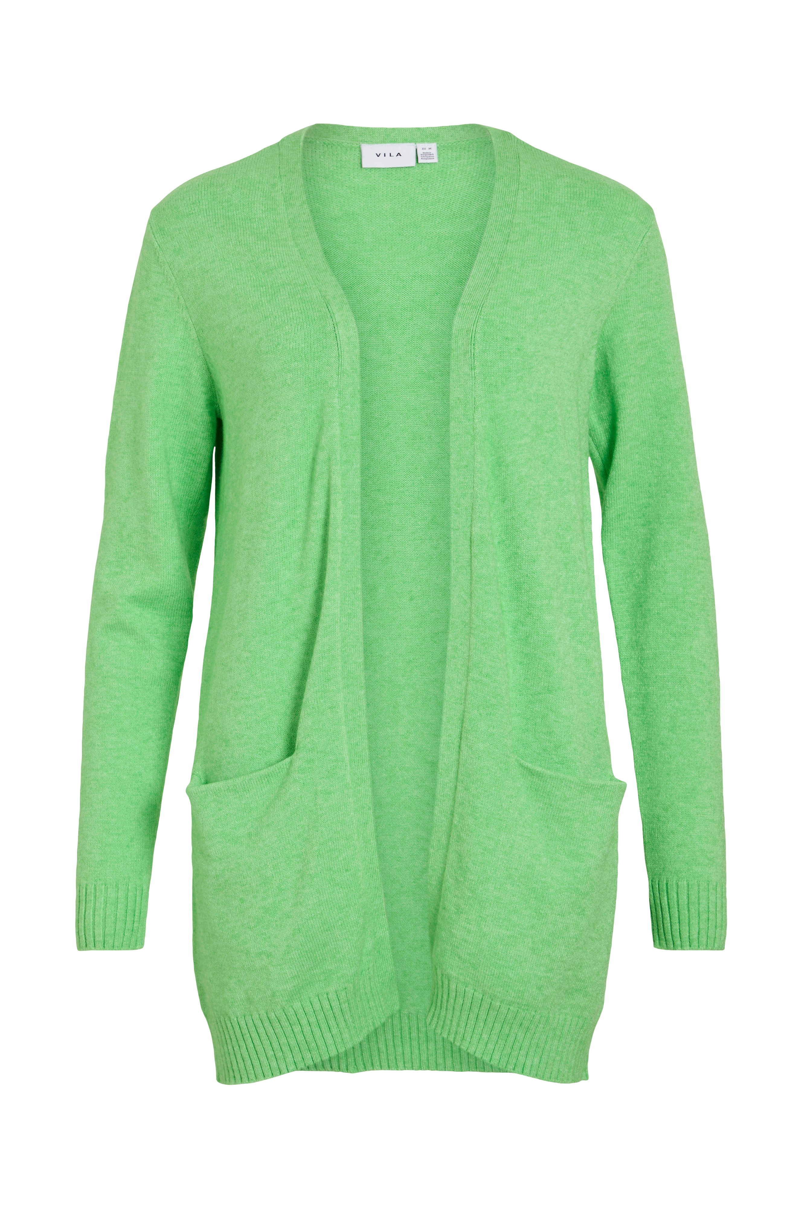 Cardigan viRil L/S Open Knit fra Vila. Lang, flot model uden lukning med indvævet kant foran. To indsatte lommer og groftribbet kant i ærmekanten og forneden. Længde ca. 84 cm i str. M.