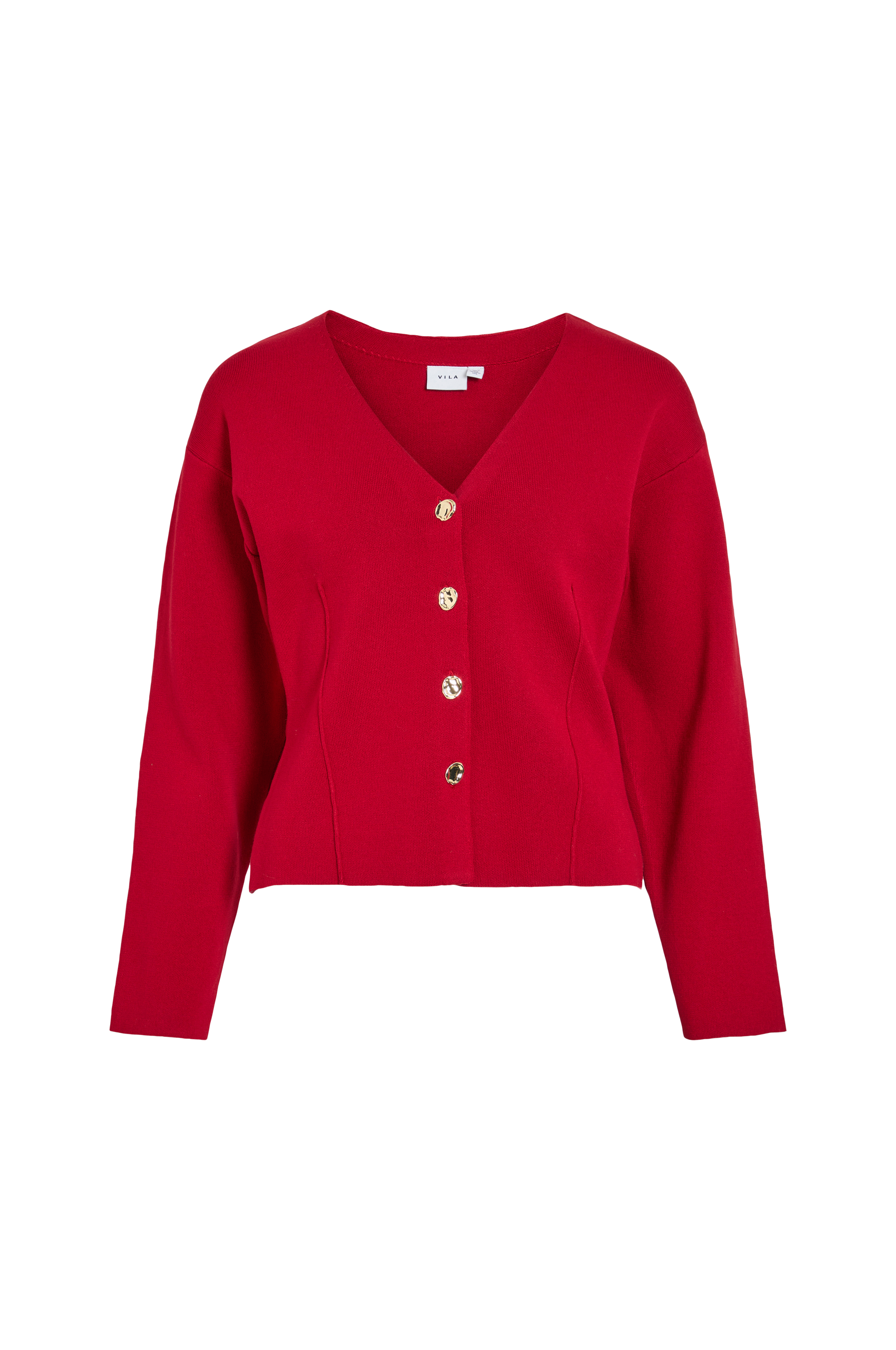 • Figurformede cardigan med v-formet halsudskæring• Lange, indsnævrende ærmer• Guldfarvede, irregulære knapper foran