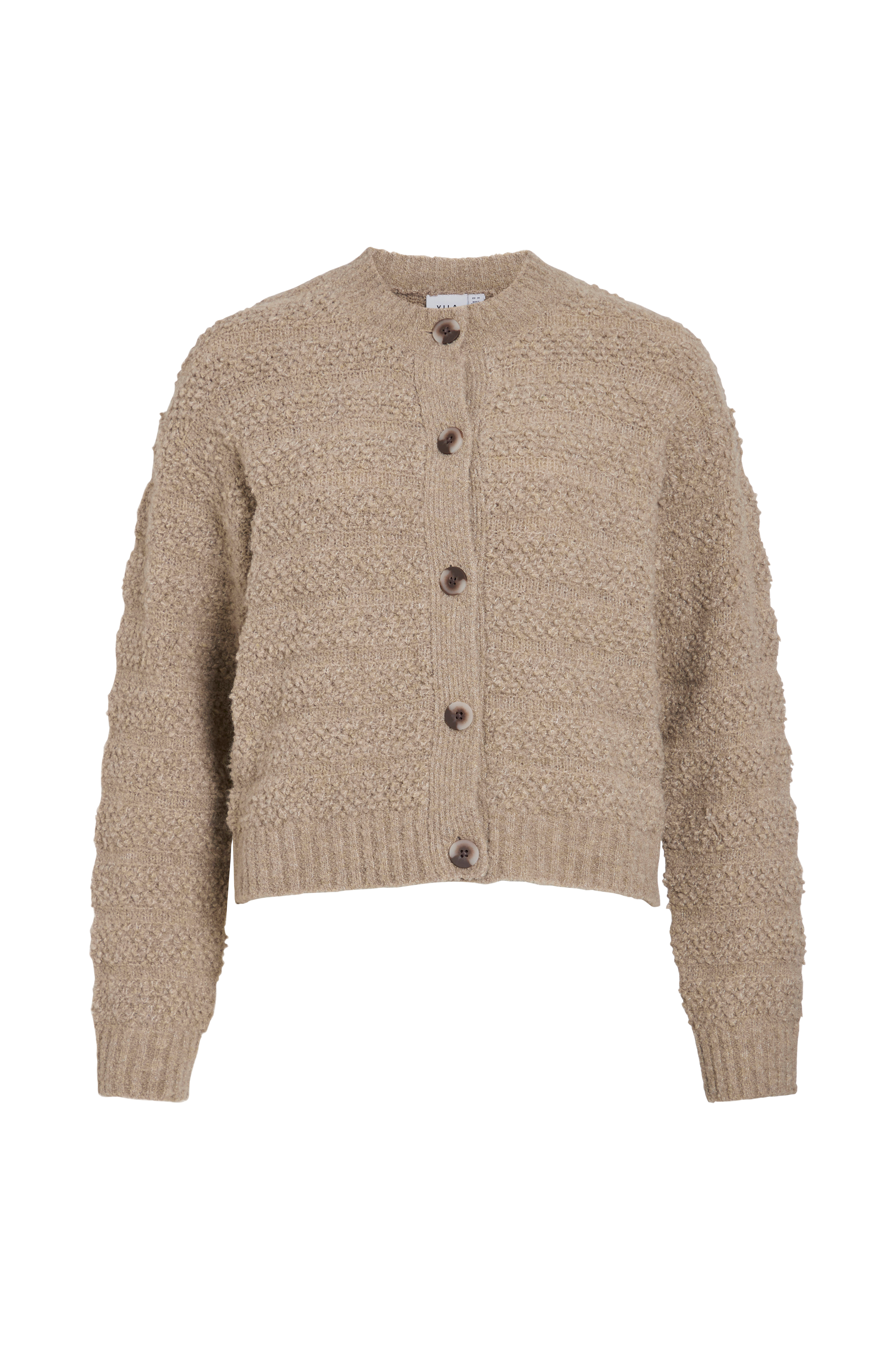 • Strukturstrikket, langærmet cardigan• Rund, ribbet halsudskæring• Knapper foran• Ribstrik ved manchetterne og ved nederste kant