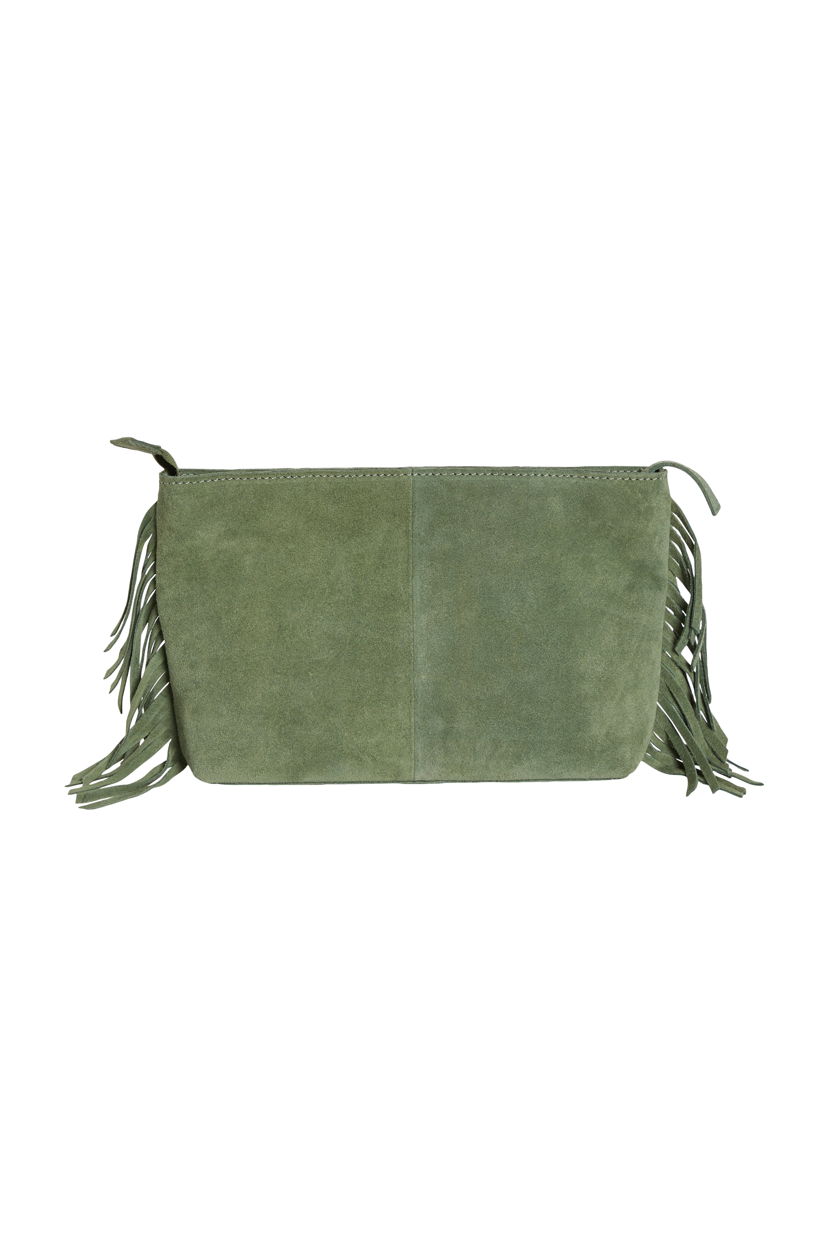 • Clutch i ruskind• Frynser i siderne• Tekstilforing• Lynlåslukning• Fag med lynlås på indersiden• Mål: B 25 x H 17 x D 5 cm