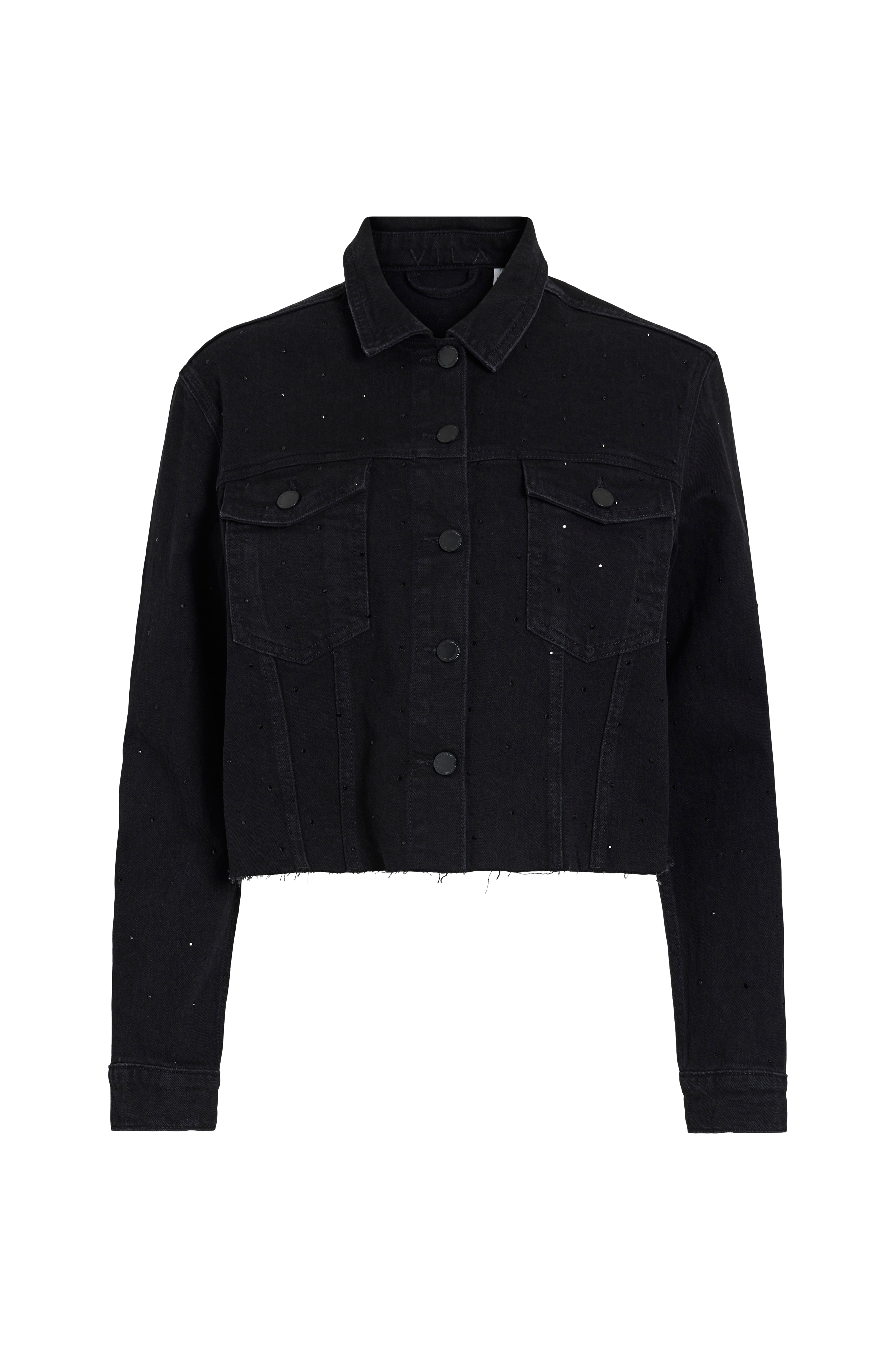 • Cowboyjakke med rhinstensudsmykning foran og rå, frynset søm• To lommer på brystet med låg og knap• Lange arme med manchet og knap• Firkantet, lidt kort pasform• Lukning med farvede knapper foran• Skjortekrave